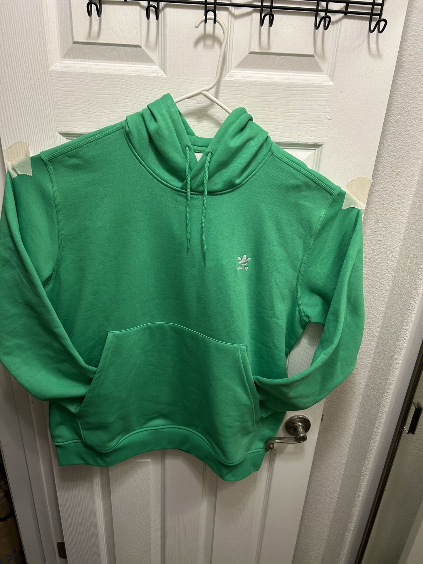 This is a brand new men's Adidas Hoodie in size XXL 2XL. The hoodie features a solid green color with embroidered logo accents, a drawstring closure, round neck, and long sleeves. Made from a blend of polyester and cotton fleece fabric, this pullover style hoodie is machine washable and designed for regular fit. It also includes a hood and pockets for added functionality, making it perfect for winter and fall seasons. Ideal for gym and training activities, this hoodie belongs to the Adidas Original product line.