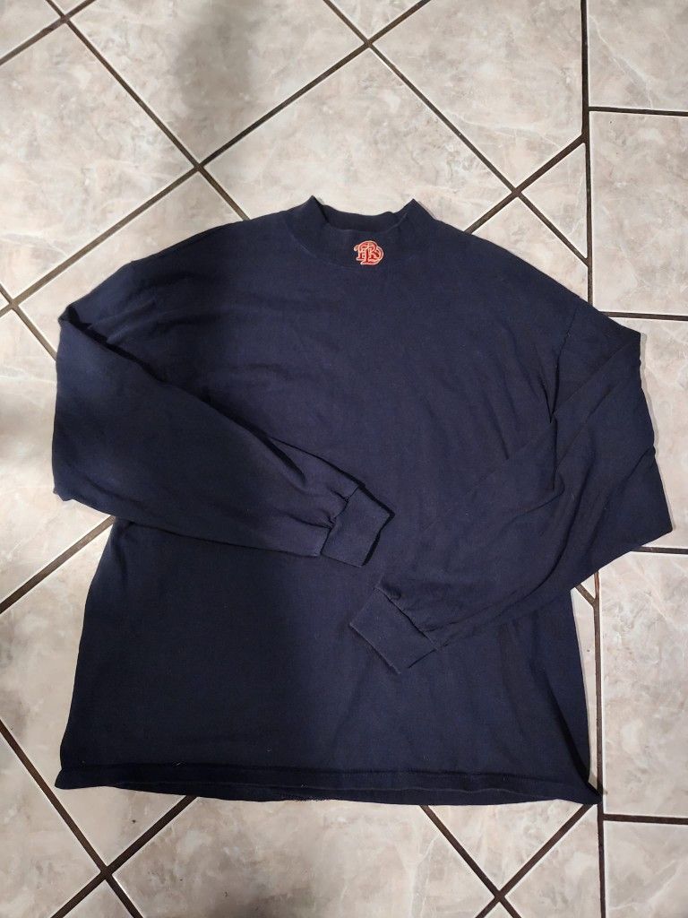 Navy blue long sleeve shirt. Features embroidered logo on the neckline. Size XL. 100% cotton. text for more information or pictures