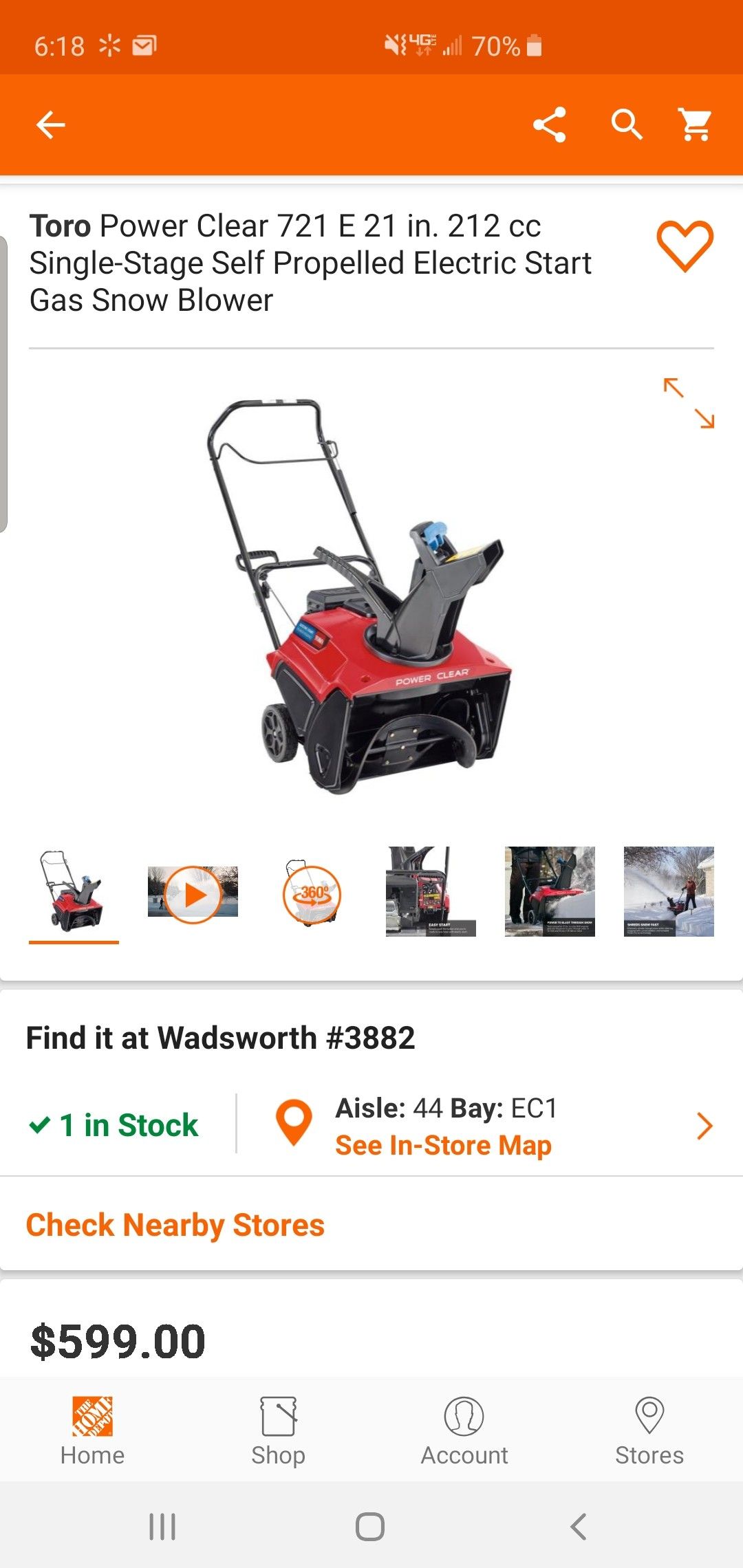 Toro Power Clear 721 E 21 in. 212 cc Single-Stage Self Propelled Electric Start Gas Snow Blower