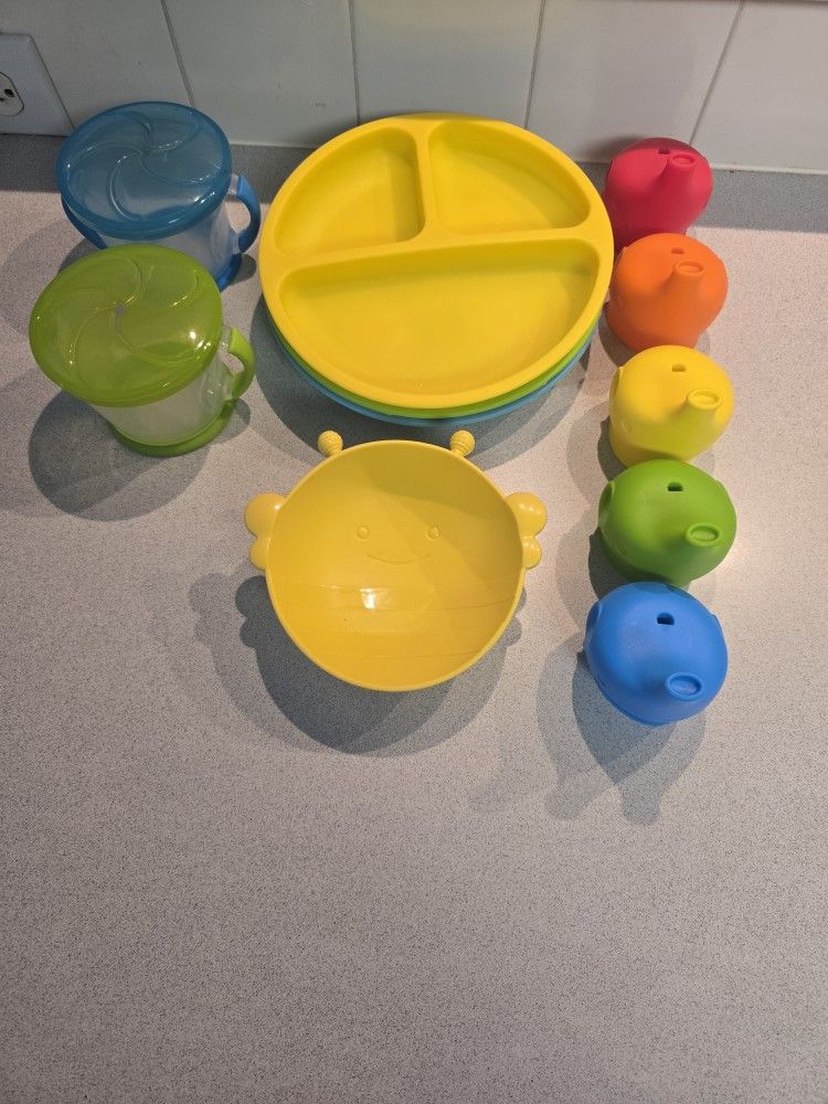 Selling a bundle of toddler feeding essentials in great condition: 2 snack cups with no-spill lids – perfect for snacks on the go 3 silicone suction plates – stick to the table to prevent spills 1 silicone suction bowl – stays in place for easier mealtimes 4 elephant-shaped silicone sippy cup lids – convert any cup into a fun no-spill sippy; the trunk is the drinking spout toddlers love! All items are made of BPA-free silicone, easy to clean, and toddler-friendly. ✨ From a smoke-free home.