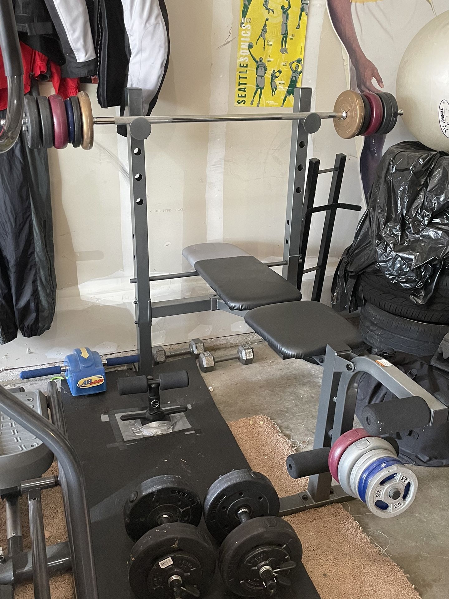 Full bench and weight set with 2 dumbbells.