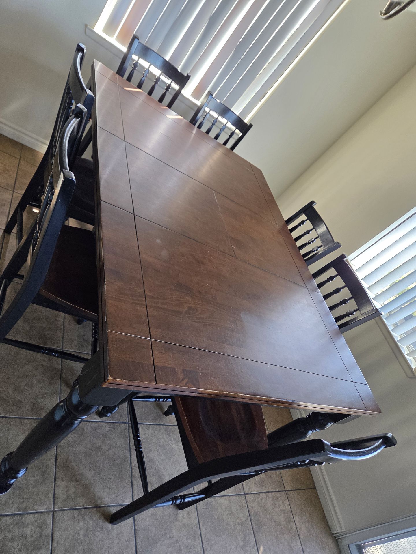 Counter Height table. Top blemishes shown. One side has a Crack. Also shown in pictures. Has a Table leaf to fold down to a Four squared table. Cash or Zelle only at pick up Table Dimensions 66 x 48 x 36 Selling due to downsizing