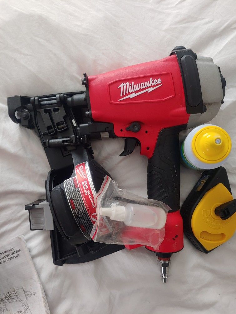 Coil roofing nailer i purchased brand new but its been sitting, i've had it for a few years so it's not new, but it is new considering i've never got around to using it i was injured in a unrelated incident. (Accident) However it's my loss because it wasn't cheap, but im fair and willing to take offers within reason. You get what's pictured, the coil roofing nailer was purchased separately, but i included the chalk line and chalk. Update; Price is firm for everyone asking, you're not going to find another never used nailer this cheap. Im not roofing anymore but still in the construction business, and any scrapes, scratch, etc etc, is probably because I've moved it around a lot in my garage, and it sat in my truck for sometime before that, because i didn't intend on selling. I added a picture of it without the tar pictured in the previous photos, theres also a little tar on the other side not pictured. But it doesn't affect performance, and it still hasn't been used. If i knew that I'd entertain selling i would've kept it in the box year's ago, but i will keep it along with every other tool i have that i don't use before i sell it any cheaper. Thanks for your time, its appreciated!