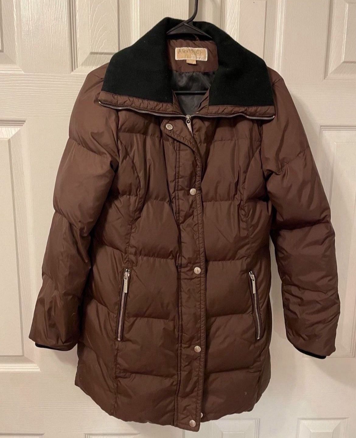 -Brand: Michael Kors -Size: Women’s Small -Style: Puffer coat (long in length; no hood) -Color: Brown -Condition: Overall good used condition; only sign of wear is my sisters name on the tag, but clean with no stains or tears (refer to pictures) -Cash only Pickup near the Indian Trails Library in Wheeling (60090)