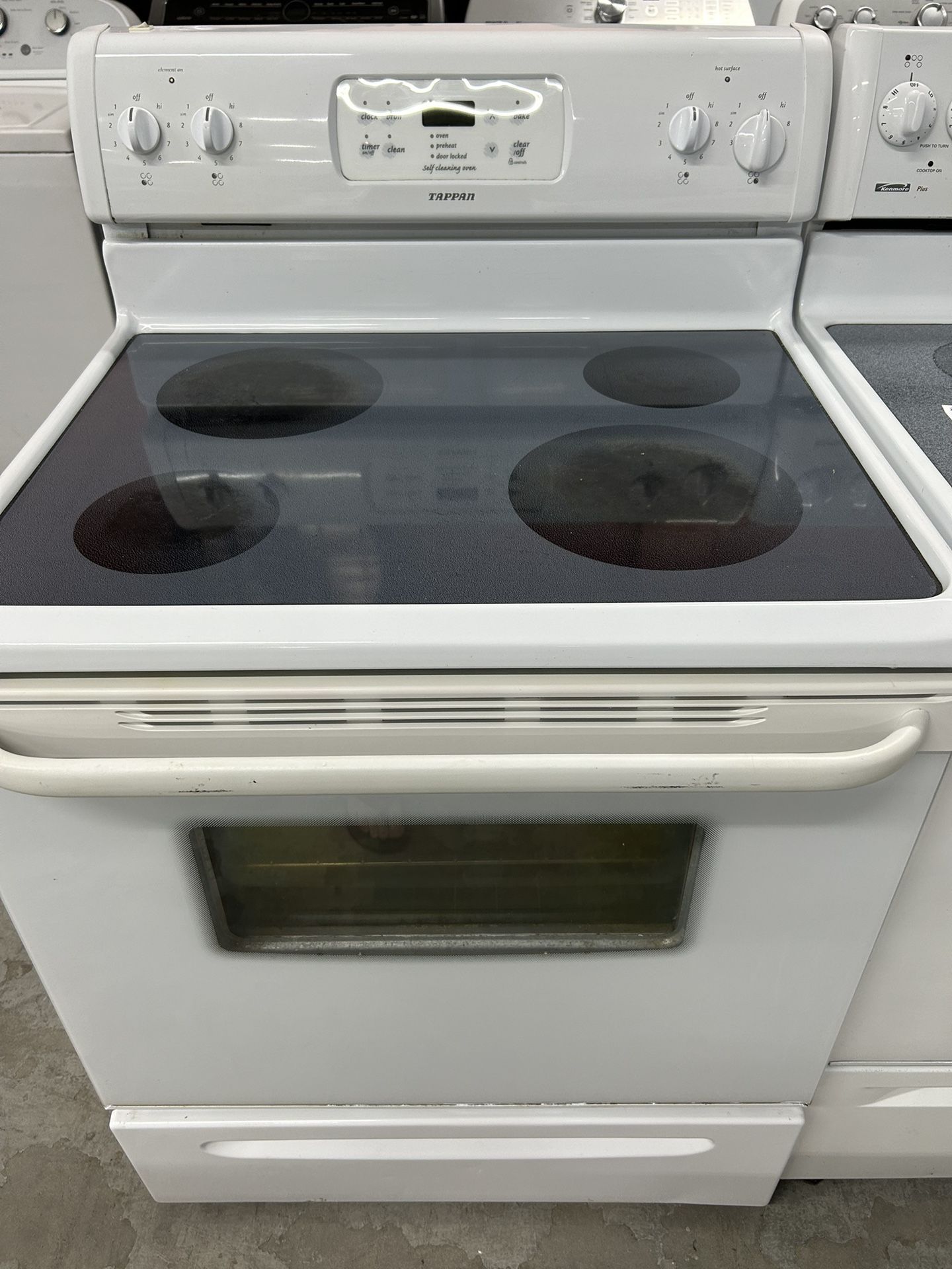 We have a Tappan,made by Frigidaire, white self clean glass top stove for sale. Top has 2 large burners and 2 small burners. Easy to use digital clock with one touch self clean and custom broil. Large oven with light and window in the door. Comes with warranty. Financing and delivery available. Questions please call three two one (contact info removed).