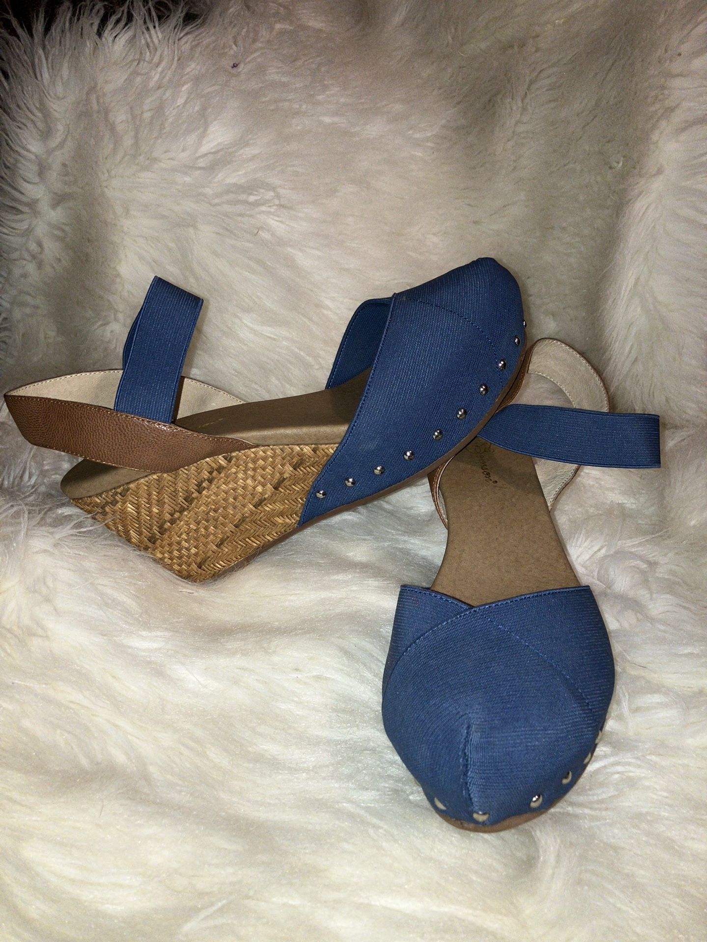 Matt Bernson Marigot Smokey blue studded espadrille Wedge sandals Originally $161 ONLY ASKING $50 SHIPPING AVAILABLE Matt Bernson Marigot Smokey blue studded espadrille Wedge sandals Matt Bernson Excellent pair of closed toe wedge sandals with -sling back and stretch ankle strap -studded detail -rafia covered wedge heel -rubber sole -beautiful condition