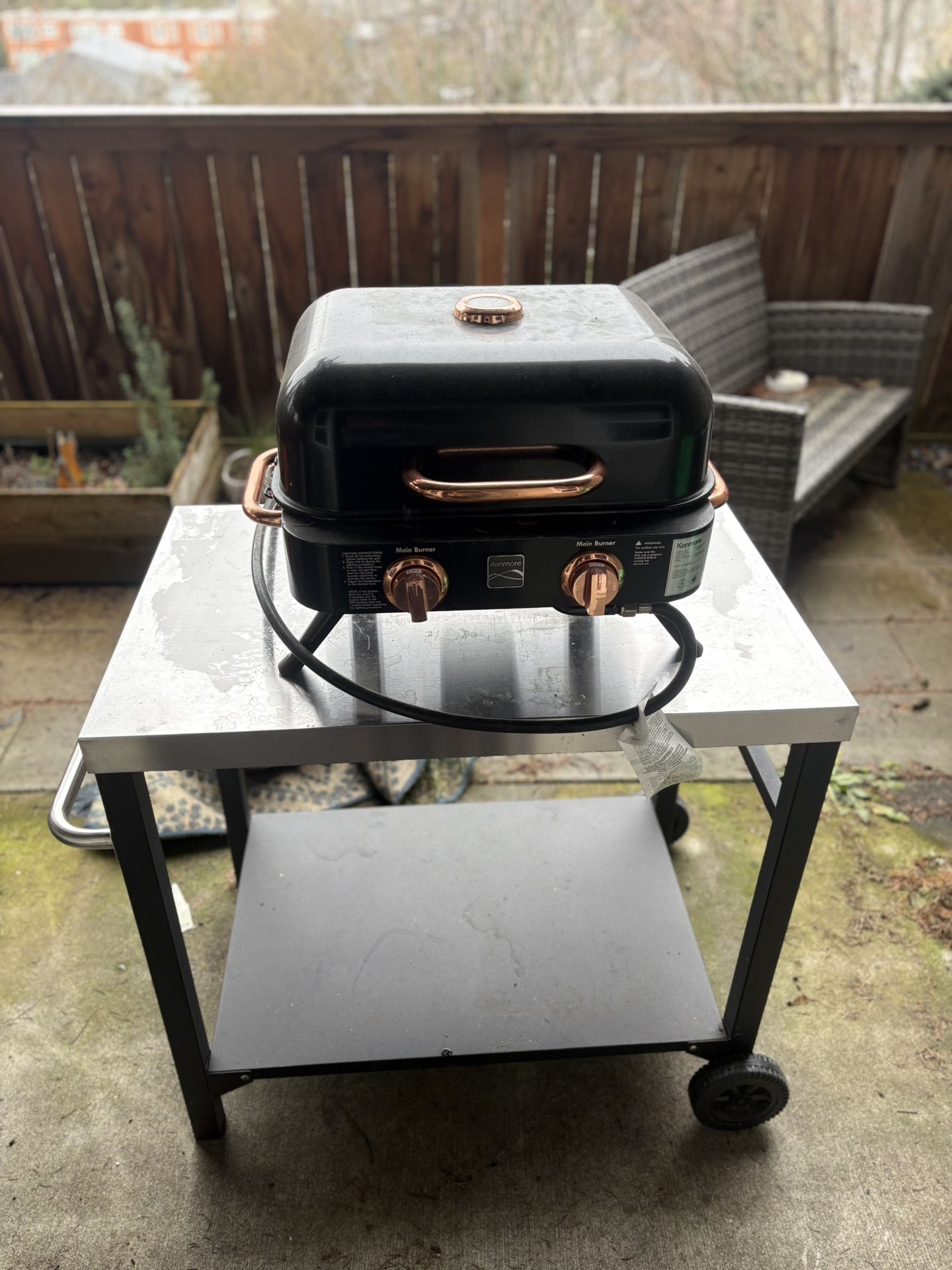 Propane grill and outdoor table in working condition, bought new last summer. Buyer must haul.