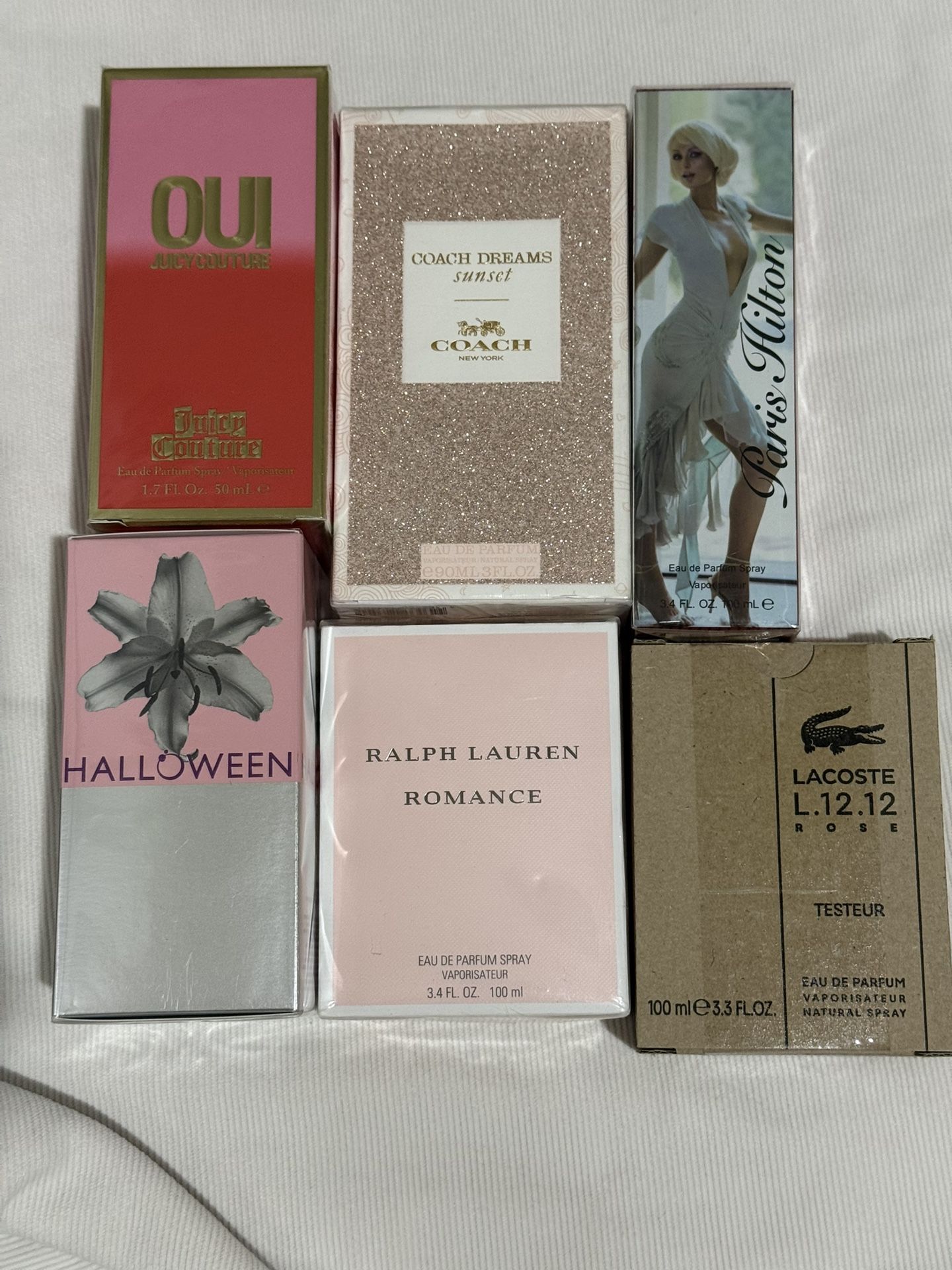 Juicy Couture Perfume 1.7oz SEALED $40 Coach Dreams Sunset Perfume 3oz SEALED $50 Paris Hilton Perfume 3.4oz SEALED $30 Halloween Perfume SEALED $40 Ralph Lauren Romance Perfume 3.4oz SEALED $75 Lactose 12.12 Rose Perfume 3.3oz SEALED $50