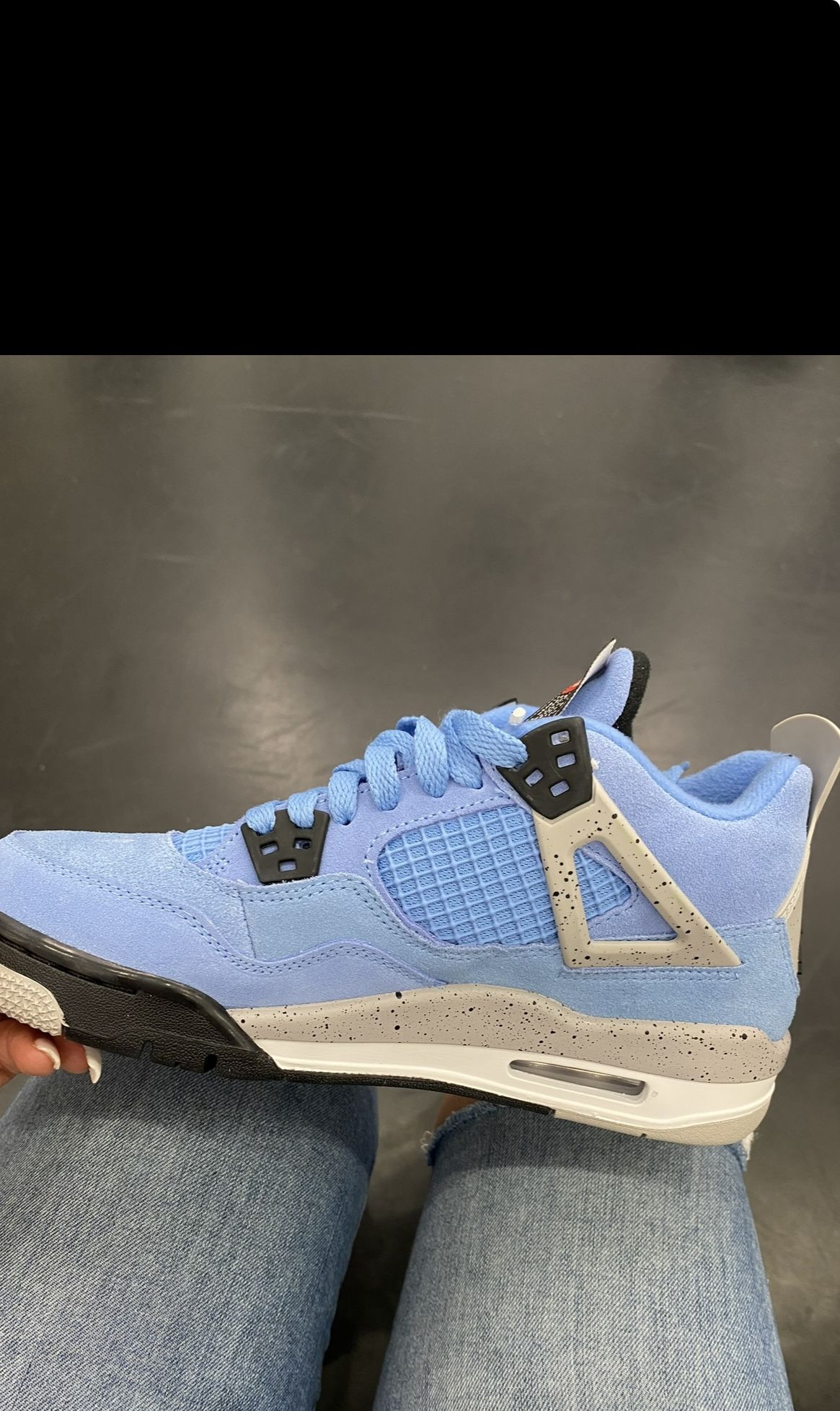 The Air Jordan 4 Retro University Blue' has the classic silhouette with a suede upper in a familiar hue inspired by Michael Jordan's UNC alma mater. The bright blue palette is contrasted by a speckled grey finish on the sneaker's supportive wing and back heel, featuring a raised Jumpman icon in black. Two woven labels are stitched to the tongue; one being the classic Jumpman woven label; the other being a Team Jordan jock tag that typically appears on the bottom hem of Jordan jerseys. A black, white, and Tech Grey sole with a clear Air unit completes the design. Size 6 Men / Size 7.5 Women