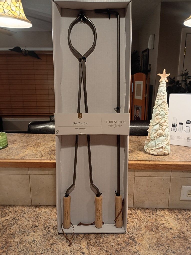 NEW still in box, never used. 2 pc Threshold brand Fire Poker and Tongs Set in Black. Great for use inside for your fireplace or outside for a fire pit! Made of metal with wooden handles and hanging loops. I have 2. The price is PER set. See the last 3 picture for more information and what Target charges- I'm cheaper