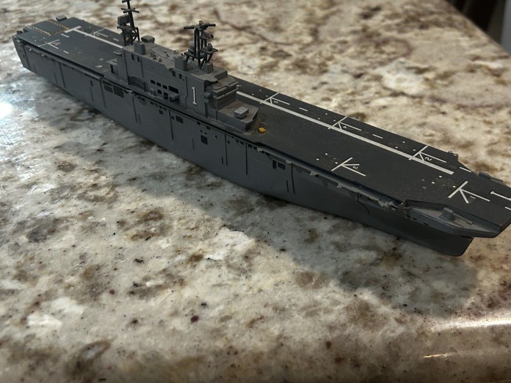 Meticulously hand built and very detailed display model of a US aircraft carrier, specifically the USS Tarawa. These models go for a good amount more especially when they are this well built, this is priced to sell. A beautiful piece that would make a great addition to a collection. Dark flight deck with crisp details and markings. If your a naval historian or model ship collector this is for you and at a great deal.