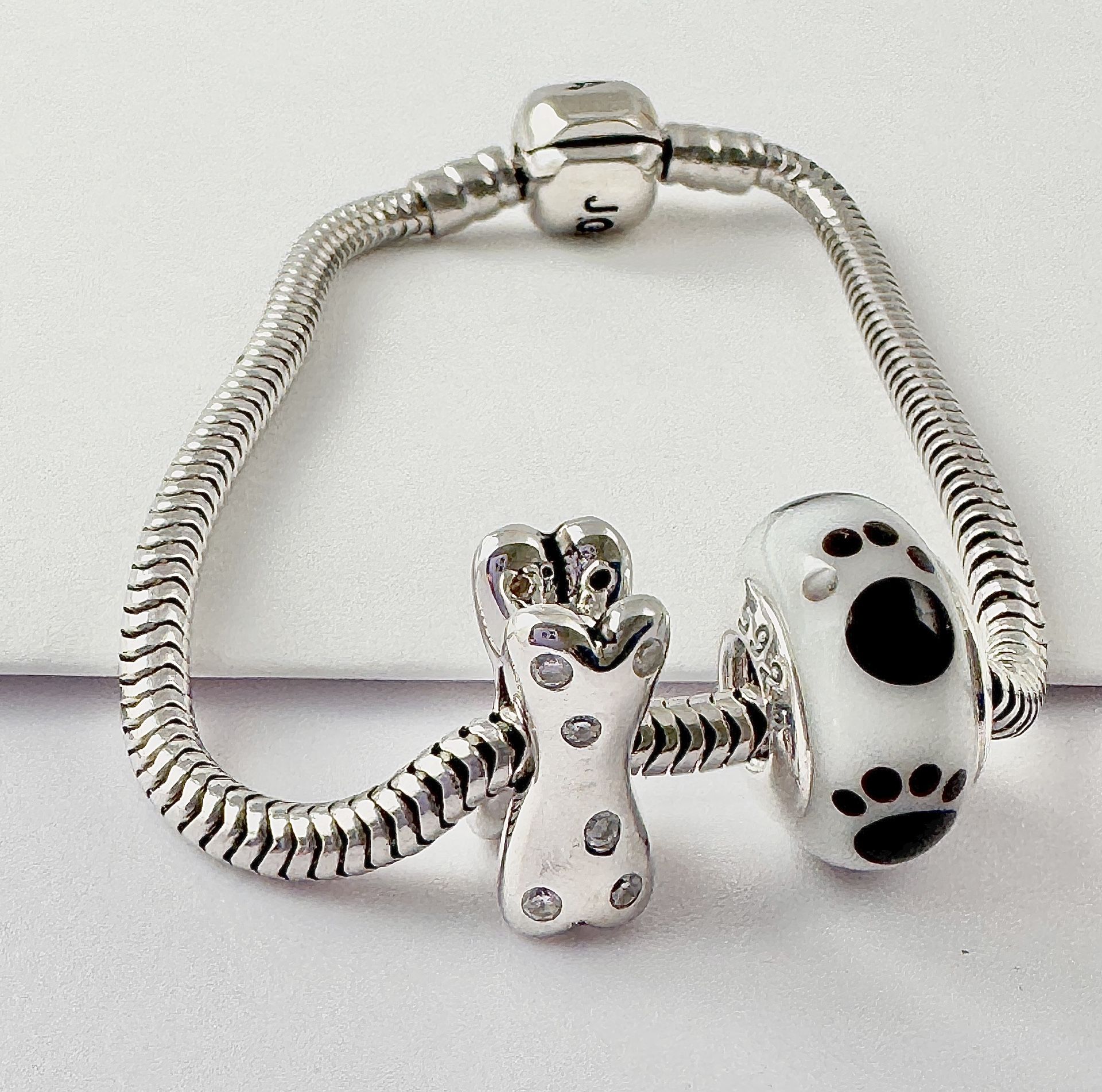 2 Charms For Pandora 925 Sterling Silver Dog Bone With Swarovski Crystals And Paw Murano