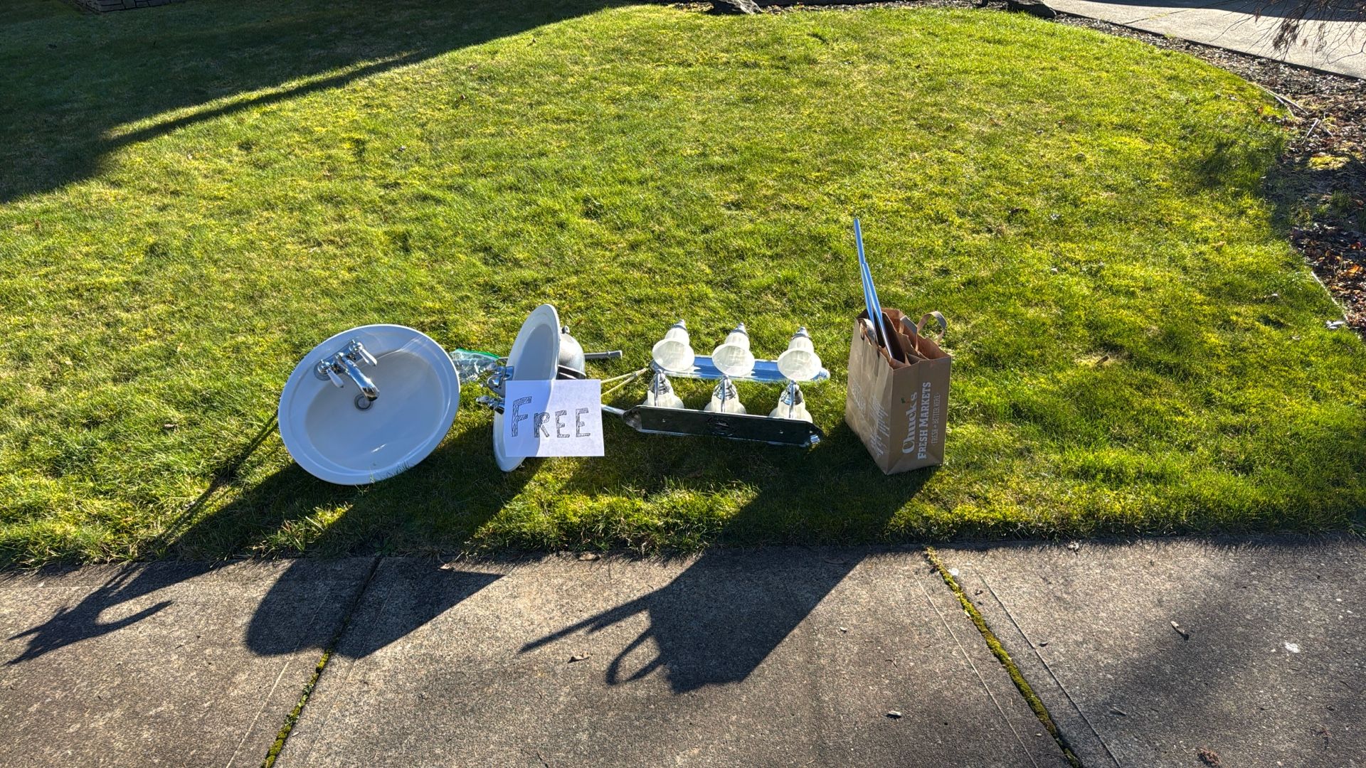 2 sinks with faucets, bathroom lighting, bathroom rods.