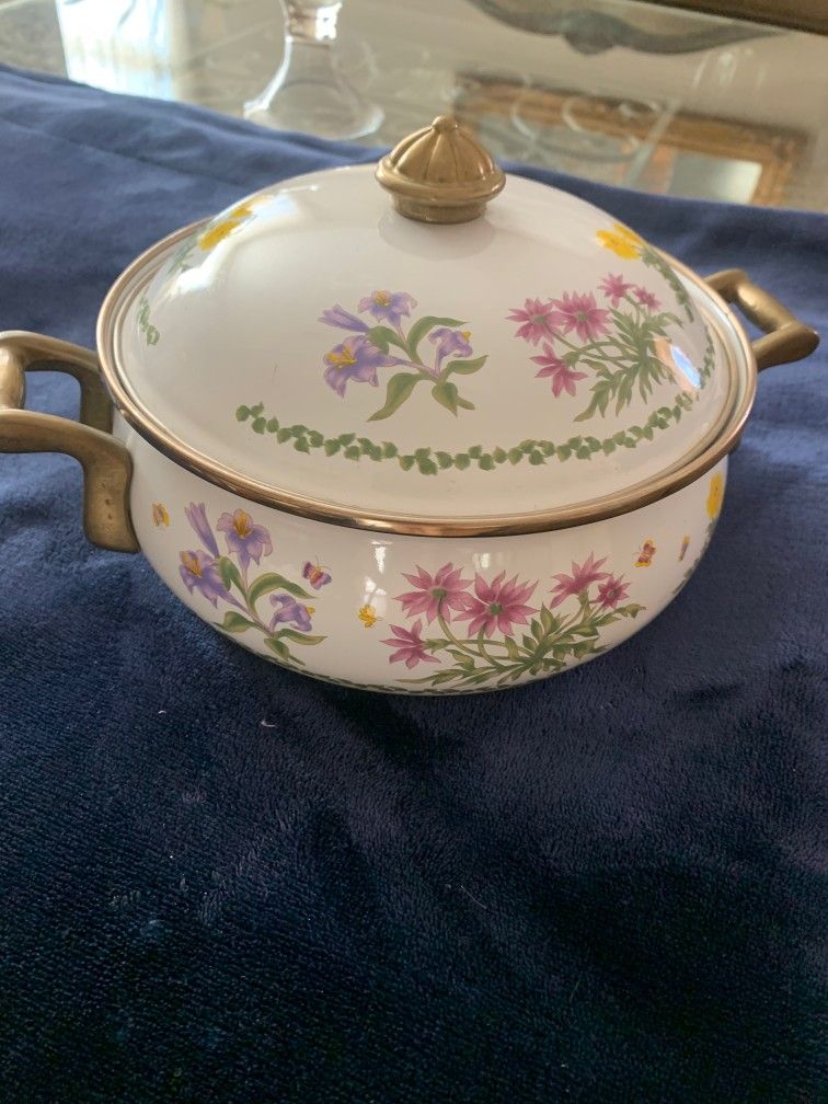 New Medium Vintage flower pattern Enamelware. 2 quart Casserole / Soup Dutch oven pot with Lid and Brass Handles for $20 Cash & pickup