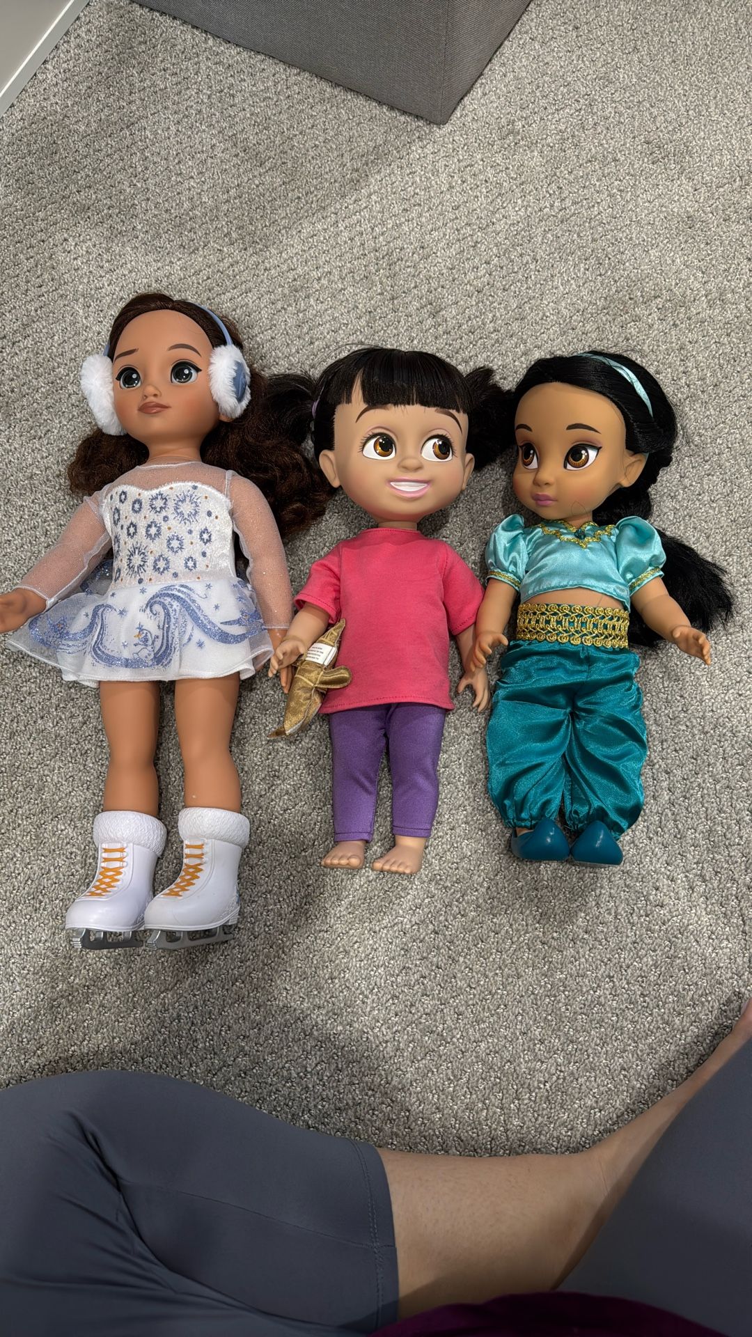 Boo and jasmine are 12”. Ice skater is 18” and has Olaf on dress, skates and muffs. Fairly new. Barely played with. Take all 3 for $40