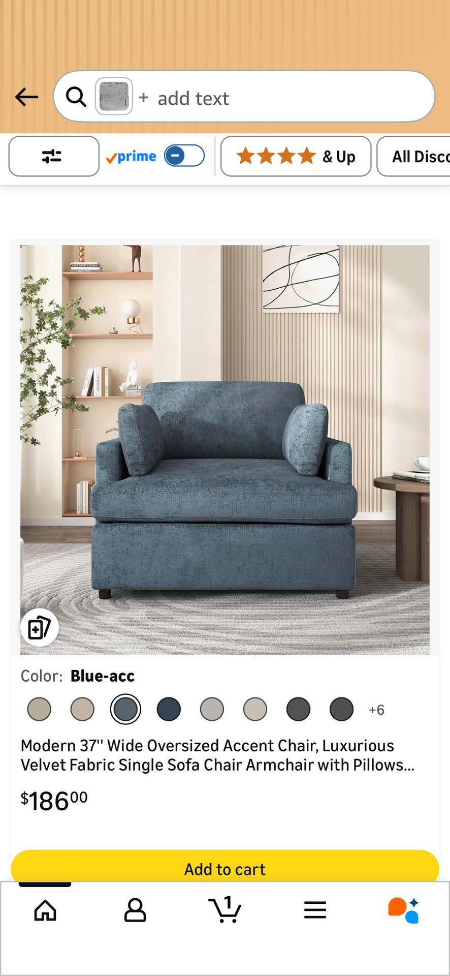 New oversized accent chair. Still in box, plastic wrap. Luxurious velvet fabric, blue color. Comes with comfy pillows. 37 inches wide. Unassembled. Still in box.