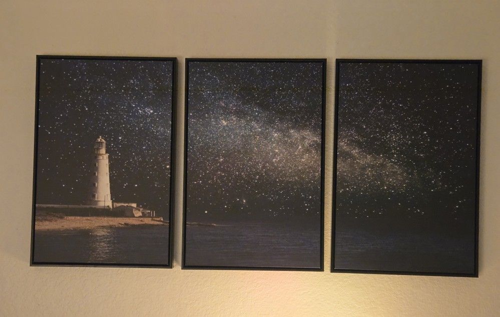 Lighthouse At Night Three Panel Canvases
