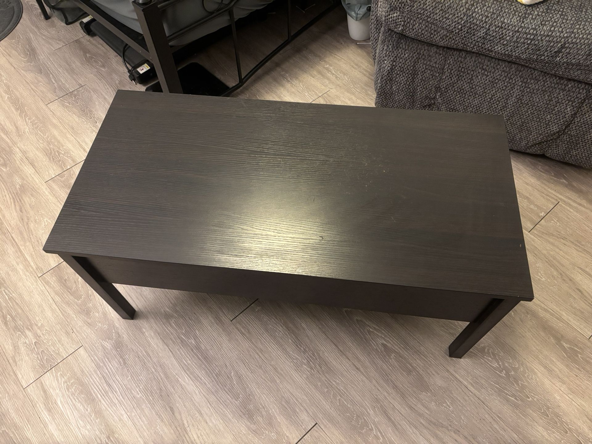 Length 38.5 Width 19inch Height 18inch Lift top coffee table. Storage on the inside. Couple marks and scratches but well maintained otherwise. (Books and blanket not included :)) $60 I’ll bring it right to your car.