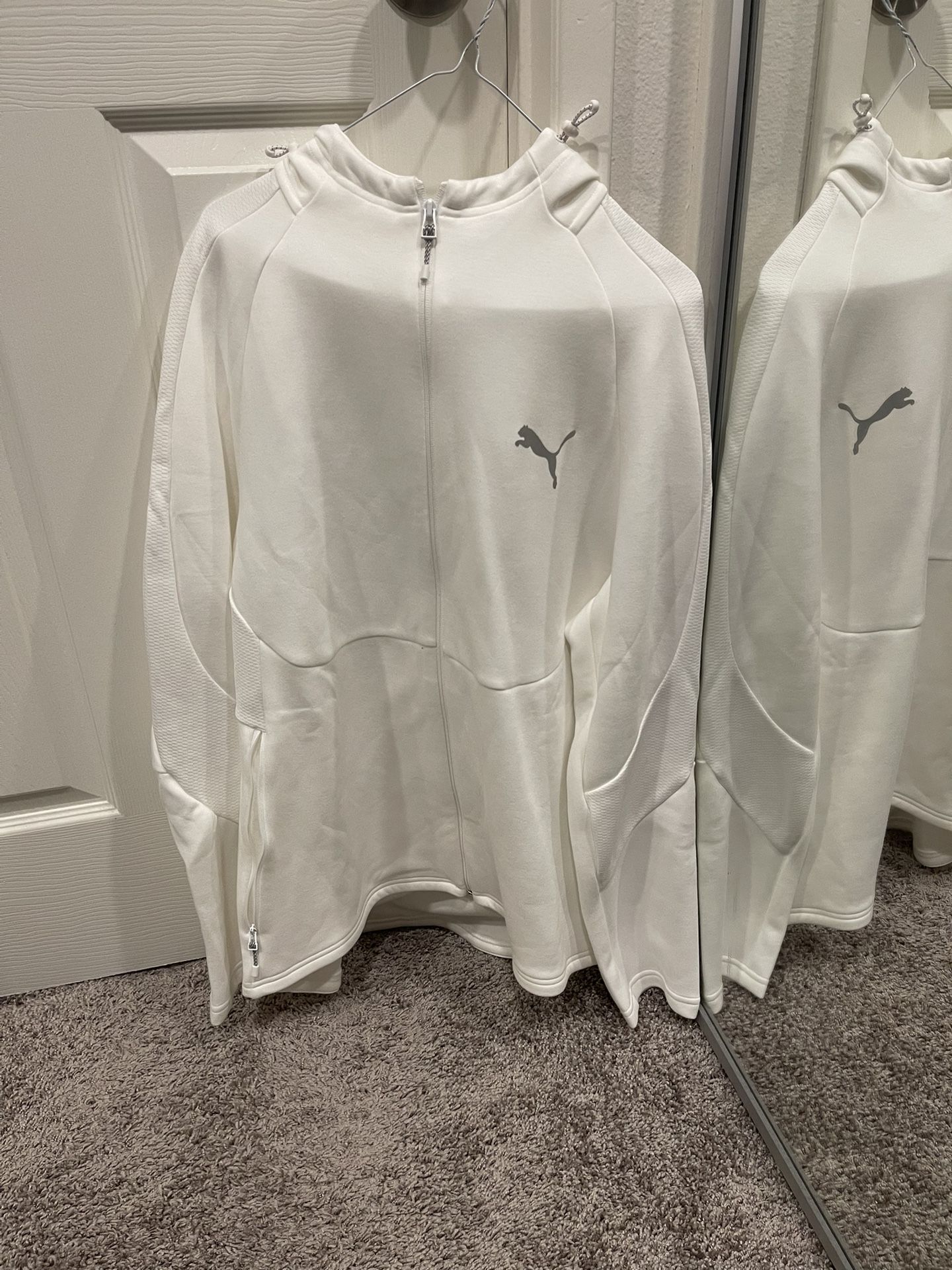 Men’s White puma, hoodie, jacket size large but this is slim fit so it’s almost like a loose medium. It is brand new with a tag. Hit me up if you’re interested.