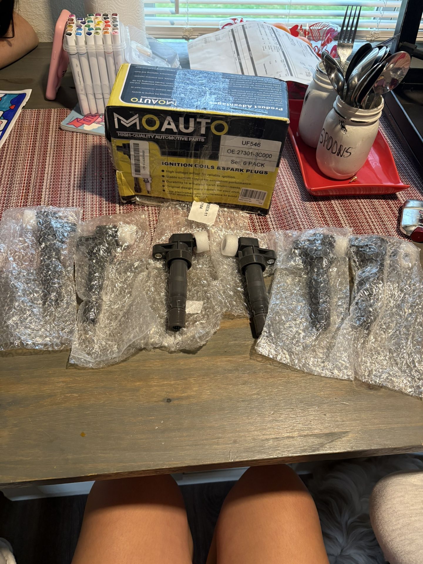 New set of 6 ignition coils and spark plugs, often used in Hyundai and Kia vehicles.