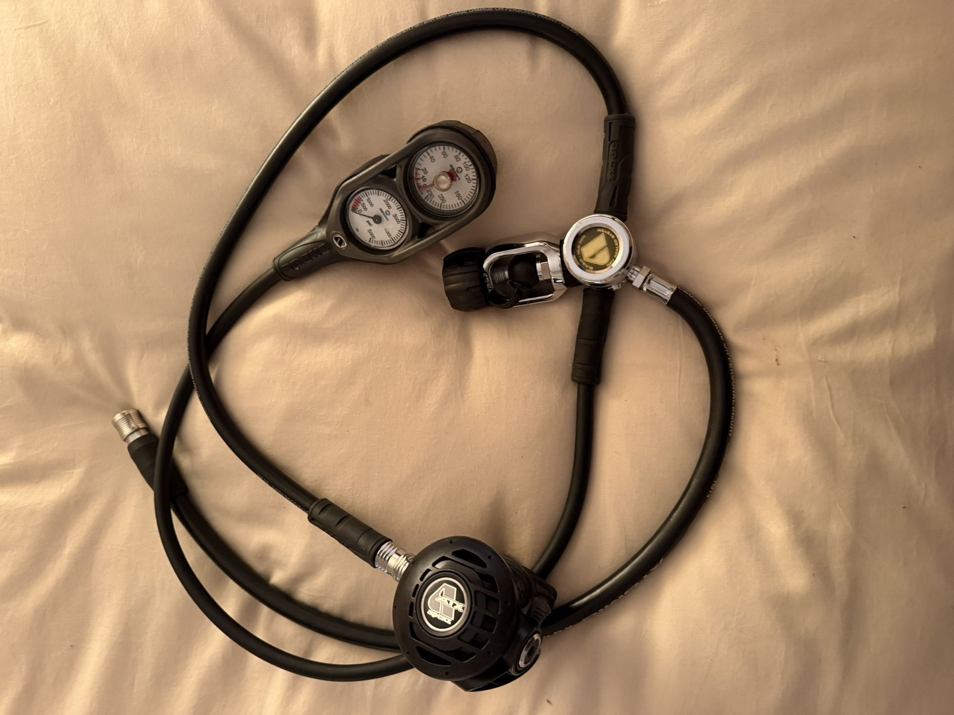 All items listed, purchased new from Ocean Enterprises San Diego. Only used a couple times, like new! Backpack: Holis 38 S Regulator: Apex ATX40 Safe Second Stage Regulator/Inflator: Atomic Aquatics SS1 Apex Depth gauge, Pressure gauge, and compass in console.