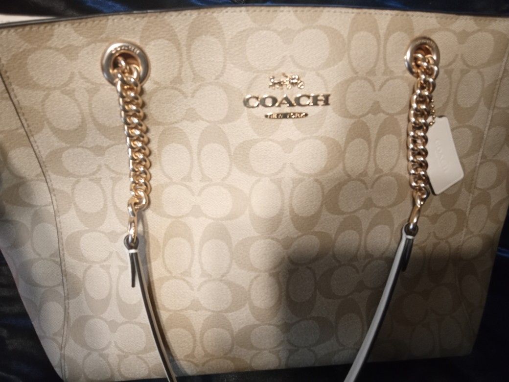 Brand new never worn Coach purse bag. Size is large over the shoulder very comfortable Tan and white color. Very Clean with tags.