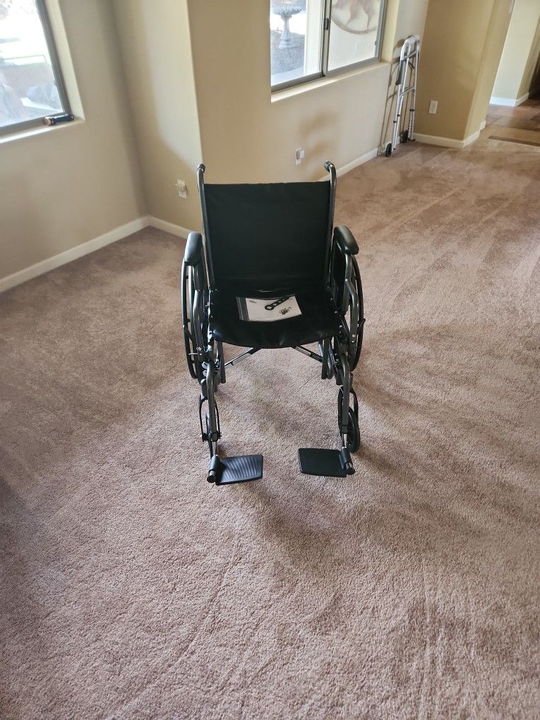 Invacare EX1 with lift-away desk-length arms, swing-away adjustable footrests, easy fold, fully padded, 20 in. seat. Brand new