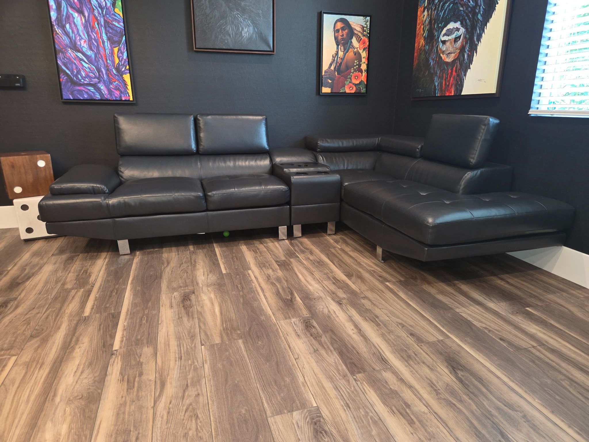 Beautiful contemporary black bonded leather sectional in great condition. Original purchase price of $1,579 (before taxes and fees). Spacious, comfortable and perfect for a modern living room or game room setup. Features: • Adjustable headrests • Built-in cup holders • Pull-out storage drawer • Bluetooth capability • Chrome legs • Sleek contemporary design Dimensions: 121.5” L x 82” W x 37” H Clean, well maintained, rarely used (was not in a main gathering room). Asking $1,000 OBO not in a huge rush to sell so not accepting excessive lowball amounts. Willing to bundle with dice end table listing for $1,200 for both