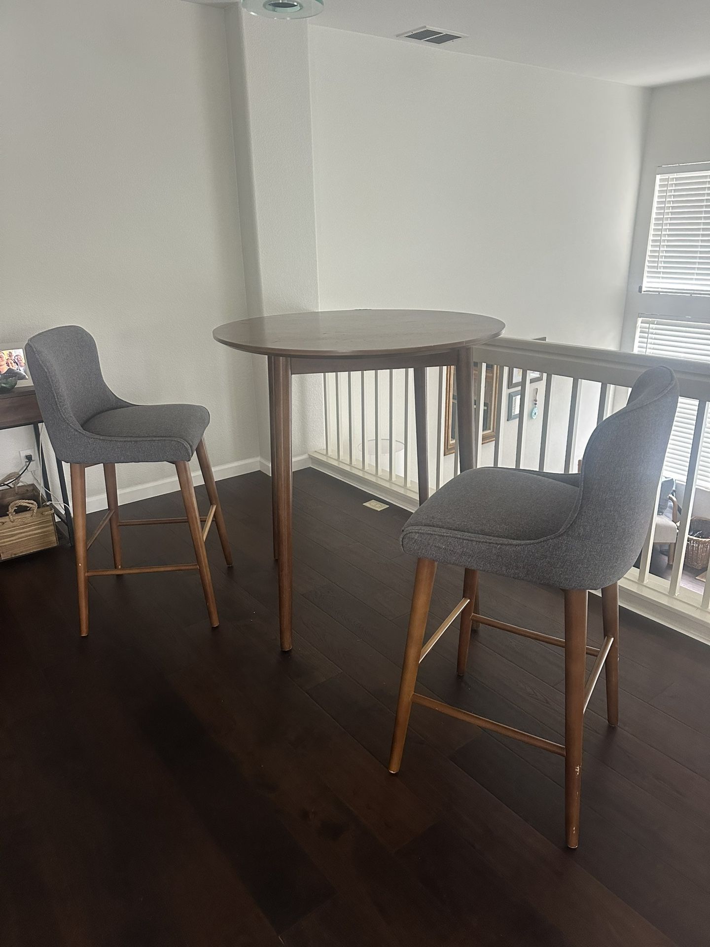 Walnut colored barstool and table originally from world market. A little ding on one side from moving but easily hidden by turning the table. Very sturdy. Table can be taken apart for transport. Must pick up