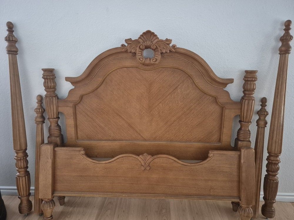 Solid wood four poster bed frame with removable posts. Includes headboard, foot board, side boards and four posts.