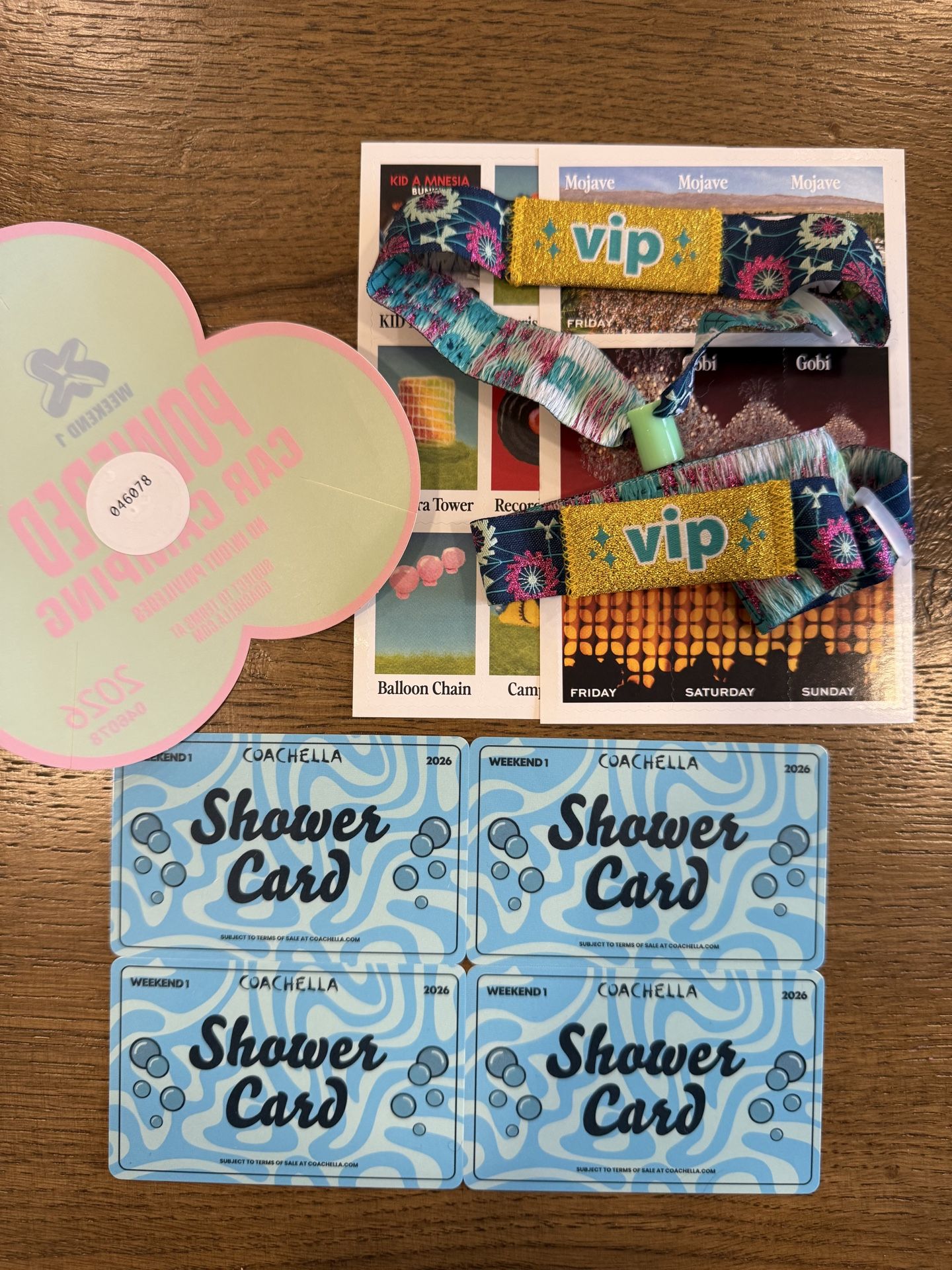 (2) Weekend 1 VIP tickets (1) Power Camping Pass Plus shower cards which give you access to private restrooms and showers! $3500 for all