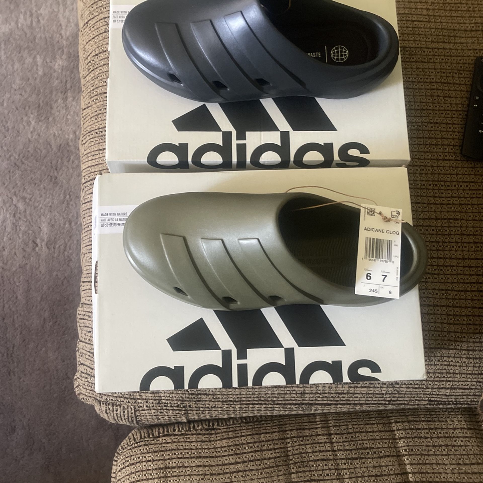 I have two pair of unisex Adidas slides brand new never been worn. They are a size men 6 and women 7 . These slides may run a little big maybe a half size bigger. Otherwise the color is ARMY green and black.. these shoes were originally $50 a pair. Selling for $25