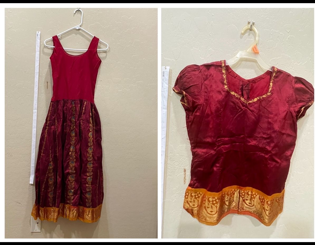 Soft silk material with cotton lining, Has beautiful golden work and border on neck and sleeves, think border on bottom of blouse and bottom of skirt. Length of long part from shoulder till feet = 46 inches Length of blouse = 18 in Chest circumference = 31 in Can be used for dance or festivals or casual wear.
