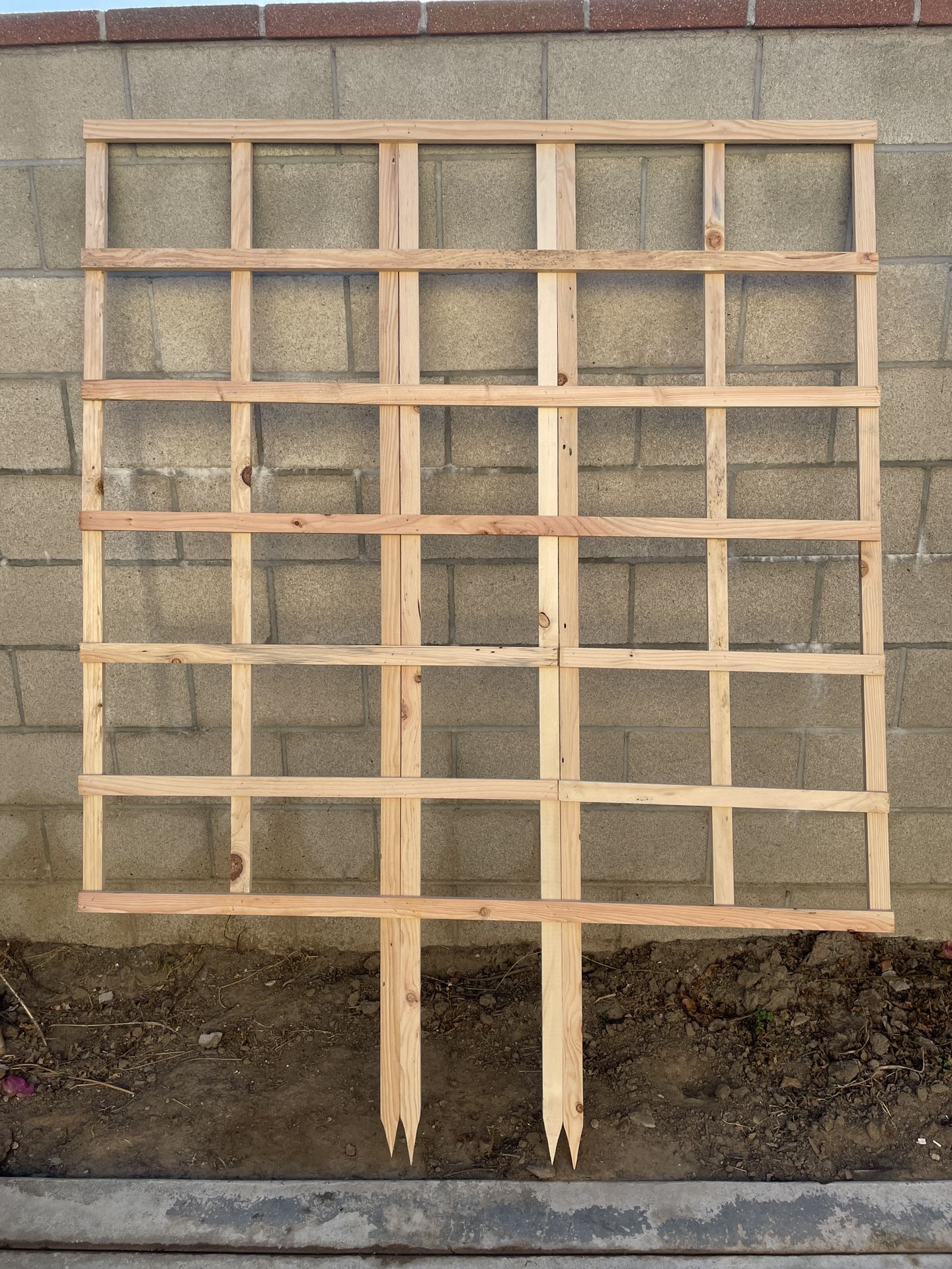 Hi, we make these wood trellises and can customized them to the size you need for your garden space. We use ours for passion fruit but these can be great for bougainvilleas, jasmine or any other vining shrubs. The trellis in the pictures is 5’x5’ (60”x 60”) but the stake part is 6.5’. $100. Feel free to message me if you need a custom size.