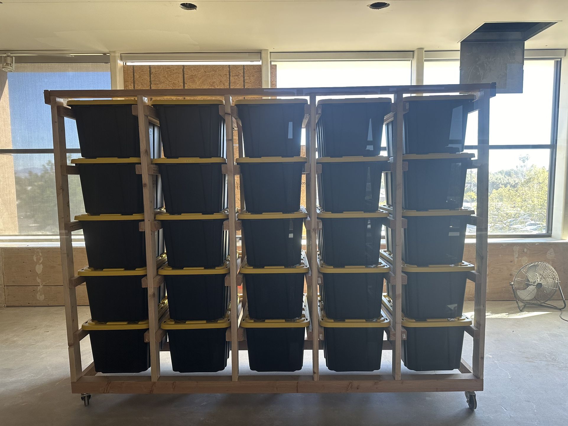 Organize your home with this storage rack for 27 gallon storage totes. All racks are custom made to order in any configuration desired. You can also choose with or without wheels and I can also make these out of steel if requested. Because they are made to order I require a deposit which is non negotiable. The one in the photos is for 25 totes and dimensions are 112” wide x 78” tall x 30” deep. This rack is $750 without the totes and totes are $15 each to add to your order. If you would like a different size and configuration, send me a message with the amount of totes you would like to be able to store and I can provide a price.