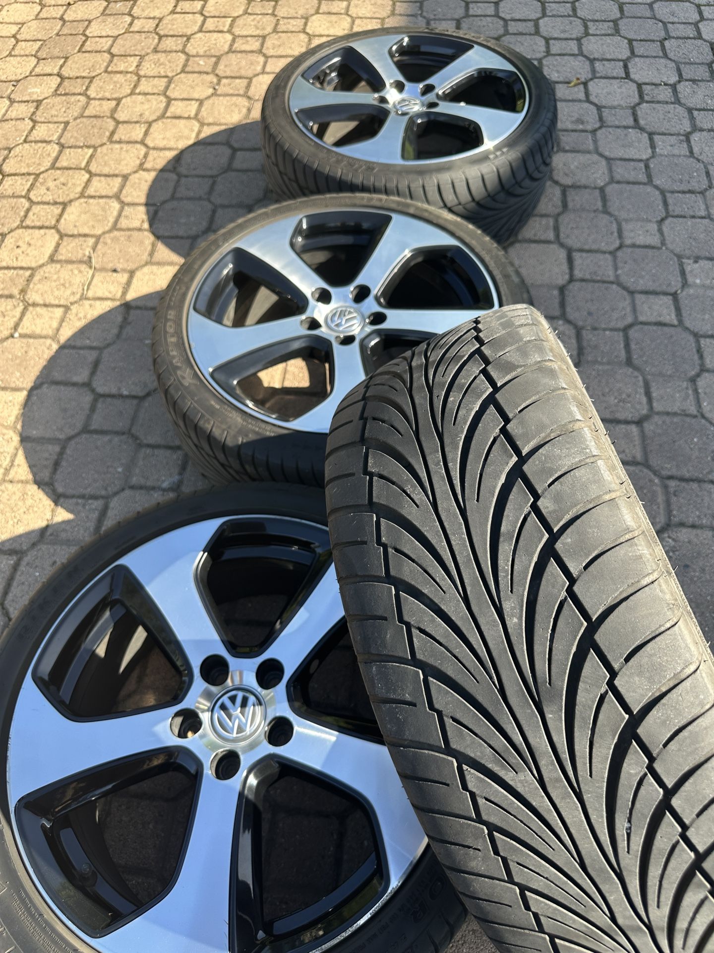 Pickup in Lakeside/Santee area, delivery available for full price. OEM wheels with tires and center caps from a mk7 2016 Volkswagen GTI, removed at 64k miles. Wheels are straight with no major damage and tires have good tread. No issues, ready to install. Diameter: 18 inches Width: 7.5 inches Bolt Pattern (PCD): 5x112mm Offset (ET): 49mm Center Bore: 57.1mm Tire Size: 225/40R18