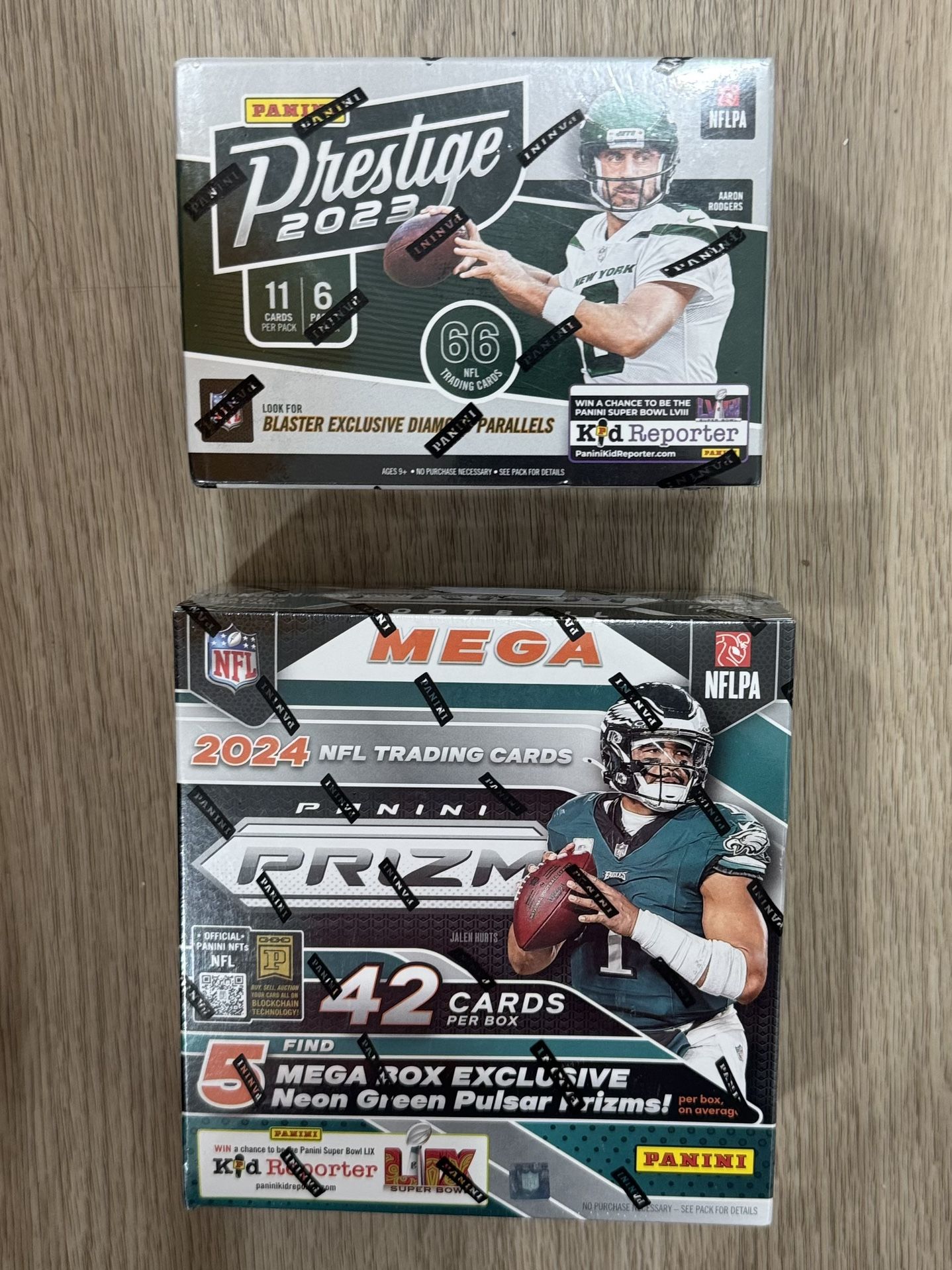2024 Prizm Mega box. Hunt for Drake Maye, Bo Nix, Jayden Daniels silver and green pulsar rookie cards. 4 available. $70 each. 2023 Prestige Blaster box. $15.