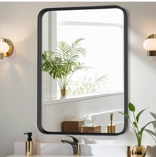 Bathroom Mirror for Wall, 36x24 Inch Rounded Rectangle Mirror, Black Metal Framed Bathroom Vanity Mirror for Restroom Farmhouse, Anti-Rust, Tempered Glass, Horizontally or Vertically Hanging # 2857D
