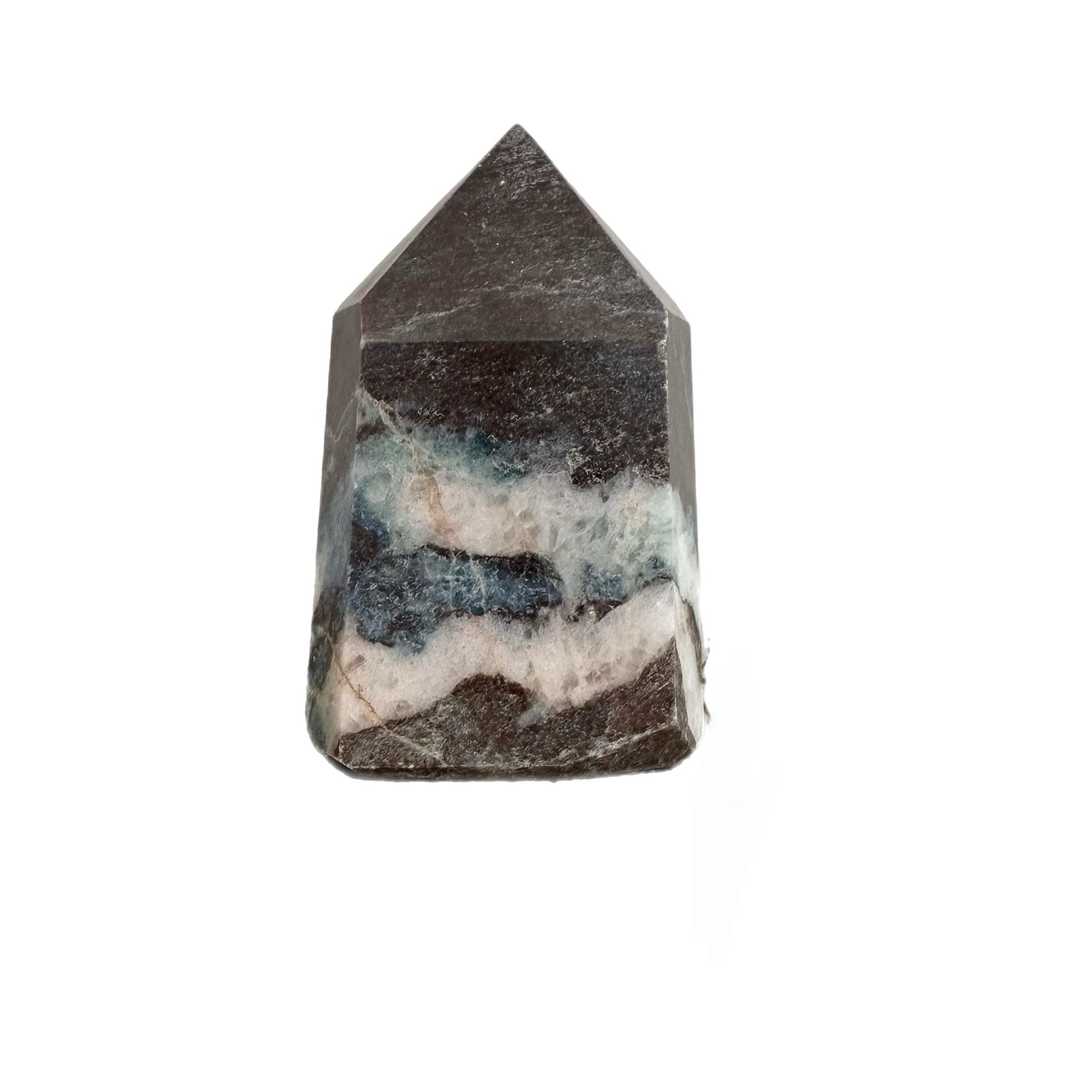 Beautiful multicolor crystal tower with shades of grey, brown, blue, and white. I’m not familiar with the type of stone, but Google search suggests it may be Moss Agate/ Black Tourmaline but I cannot 100% confirm Visually striking piece to display anywhere Height 4.75” base 3” weighs 1lb 6oz pick up in Goodyear off Estrella Parkway and Van Buren. Most forms of payment accepted