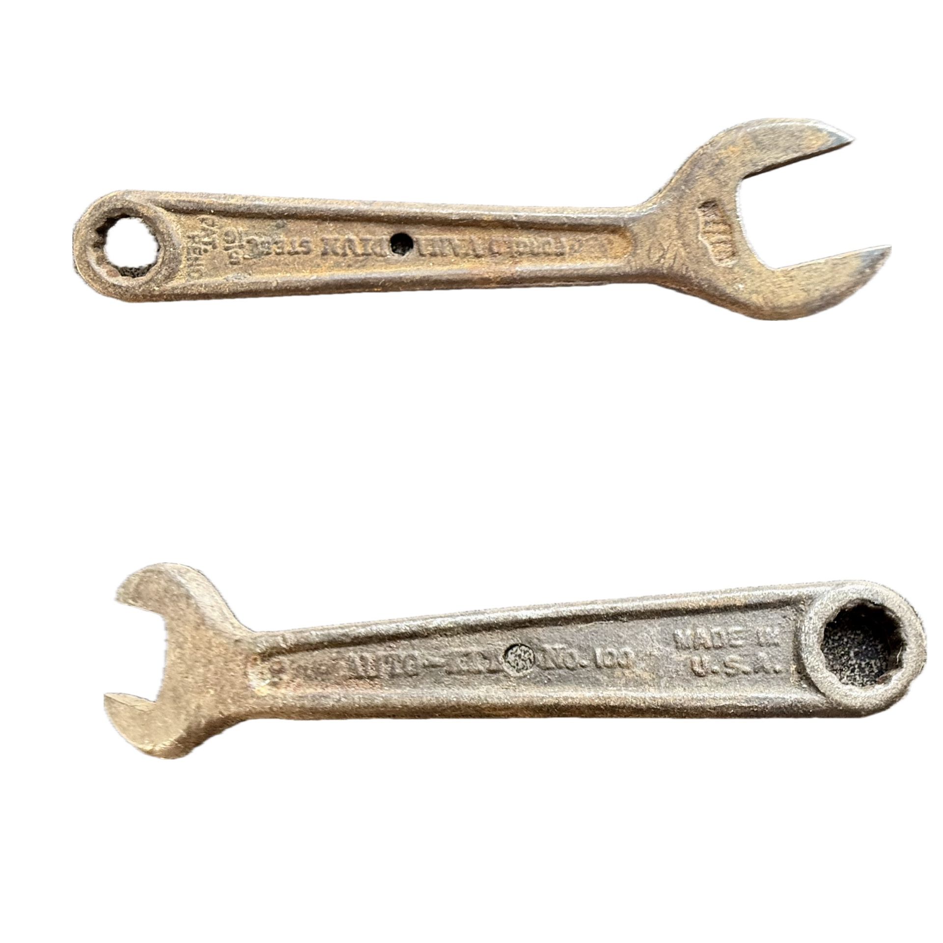 vintage "Auto-Kit No. 100" combination wrench, likely manufactured by the J.P. Danielson company in the early 1940s. This particular wrench features both an open end and a box end. It is made from forged vanadium steel and is marked "Made in U.S.A.". Originally, a complete "Auto-Kit" set would have included six wrenches and a patented tapered bolt and knurled nut to fasten them together. These wrenches are believed to have been produced during the 1(contact info removed) wartime years.