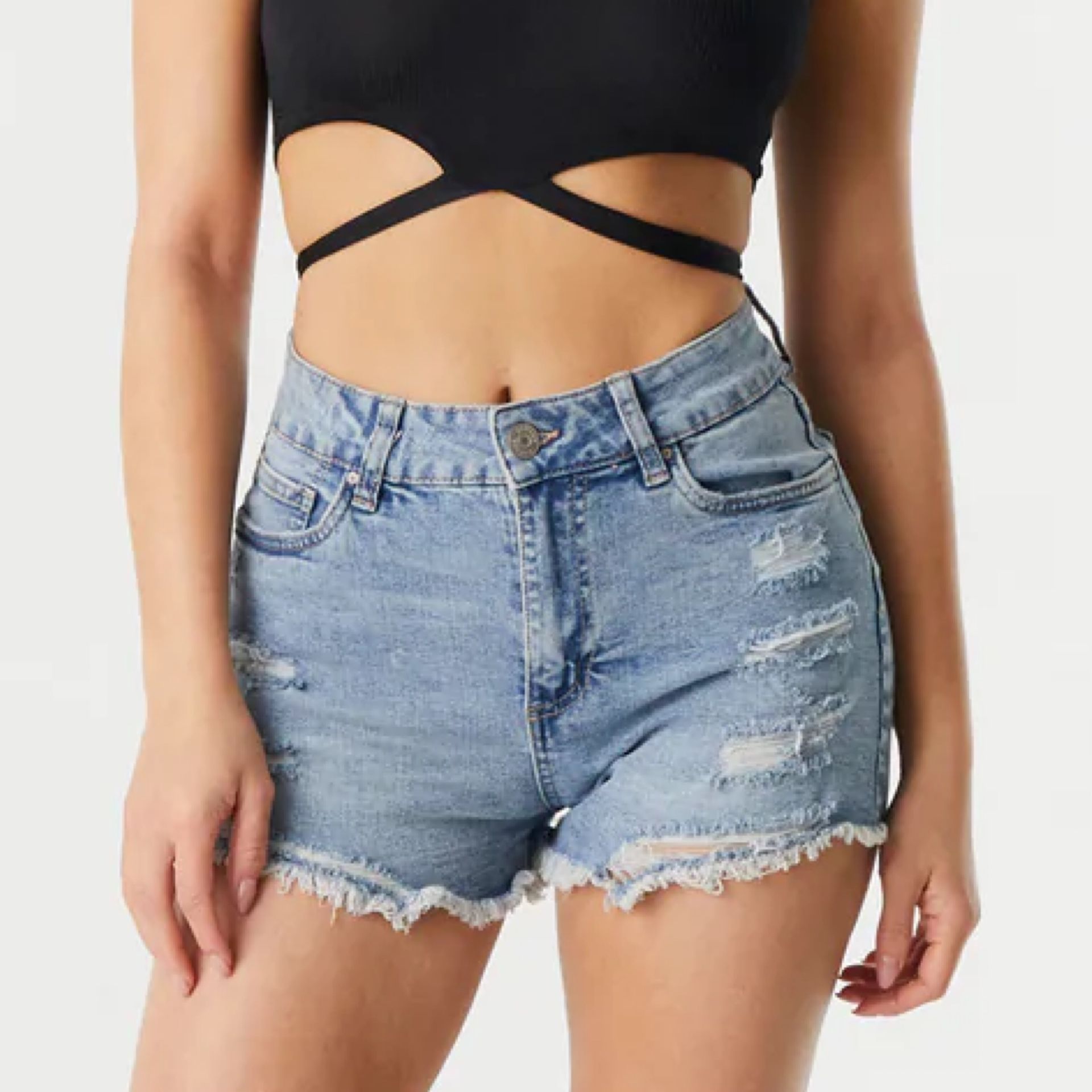 Refuge High-Rise Medium Wash Distress Denim Shorts