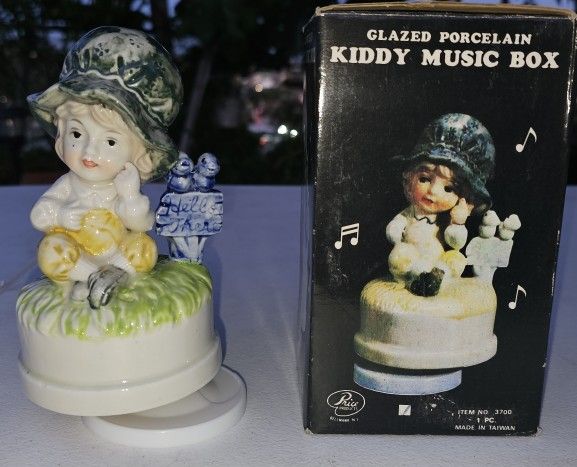 I have for sale a Glazed Porcelain Vintage Music Box With Original Box. This Glazed Porcelain Vintage Music Box by Price Products is a hand painted collectible from Taiwan, manufactured between 1970 and now. The intricate design and original box make it a unique and special decorative piece for any music box collector or enthusiast. The brand's attention to detail and quality craftsmanship ensure that this vintage music box is a timeless treasure for anyone looking to add a touch of nostalgia to their decor. The bottom round white plastic part is slightly damaged but it stands perfectly, no problem and the music plays perfectly as well. I'm asking for only $30 or best offer. Thanks.
