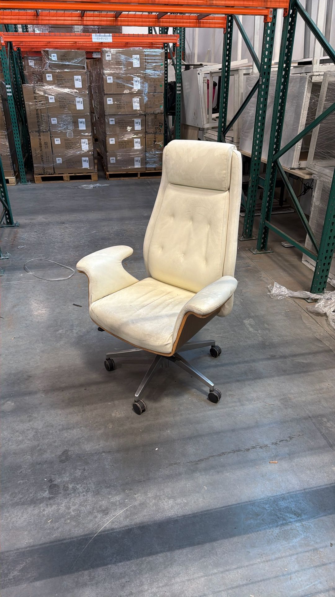 Beautiful vintage executive chair. Very comfortable with a great "Eames-style" look. Features cream tufted cushions and a wood-veneer frame on a chrome swivel base. Works perfectly. Pick up in Chino CA
