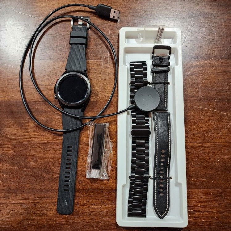Mystic Black Samsung GALAXY Watch3 45MM Works perfectly, and the bands are primarily unworn, I always wore a different mesh band. Comes with the charger and three (3) bands plus tool to adjust the band. I can not locate the box. Instructions are available on line. We loved this watch! Powerful technology, customizable, advanced health monitoring AND has the ability to have its own line and became stand alone (so you can leave home without your phone and still make/receive calls and text messages).