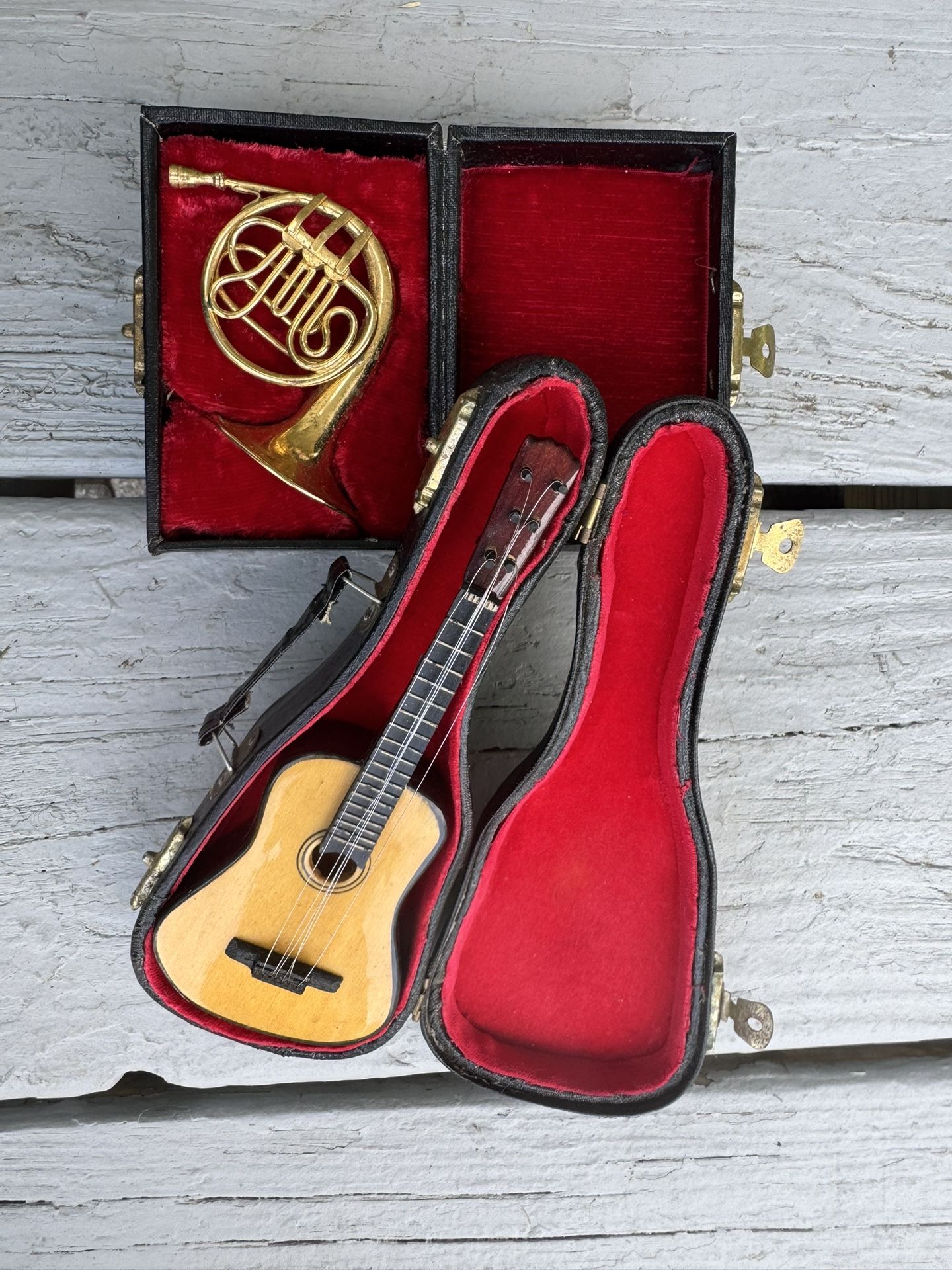 MINIATURE Guitar, Solid Brass French Horn, in Cases, Vintage