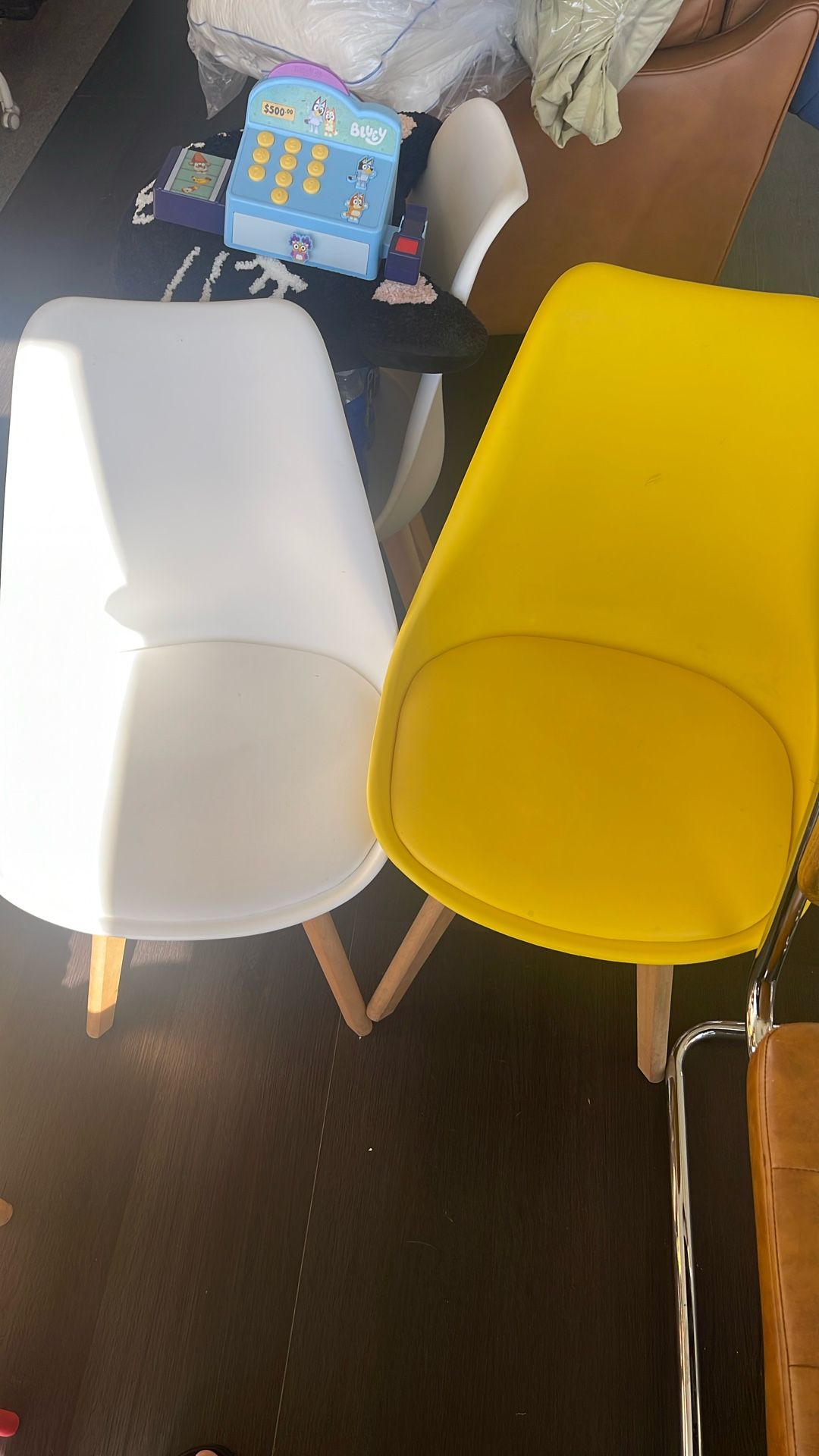Color Yellow/white Material Beech, Plastic Product Dimensions 21.3"D x 18.7"W x 32.8"H Size 21.3D x 18.7W x 32.8H in Item Weight 20 Pounds Widely Adapted:Sold as a set of 2 mid century modern dining chairs, 4 colors are available,suitable for home dining tables, restaurants, living rooms, kitchens, apartments, offices, makeup room,and holiday decorations High Quality Materials:This desk chair is made of high-grade PU leather, which is not easy to wear, scratch resistant, and waterproof, making it very easy to maintain and clean. Also,they are soft and skin friendly, without irritation Easy to Assembly:There are installation instructions and tools in the box, which can be completed within ten minutes Ergonomic Design:The seat cushion is filled with high-density sponge, and the backrest fits closely to your waist, providing a comfortable sitting experience and preventing fatigue from prolonged sitting Maximum Capacity:Constructed of strong plastic body and thicker beech wood legs to provide enough safety, weight capacity: 330lbs. The bottom of the legs has non-slip pads, which can prevent falls Overall Dimension:21.3" L X 18.7" W X 32.8" H, dimension details are shown in the picture