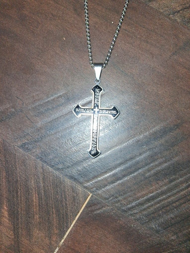 It's a metal cross chain with the prayer in small letters. It's not silver.