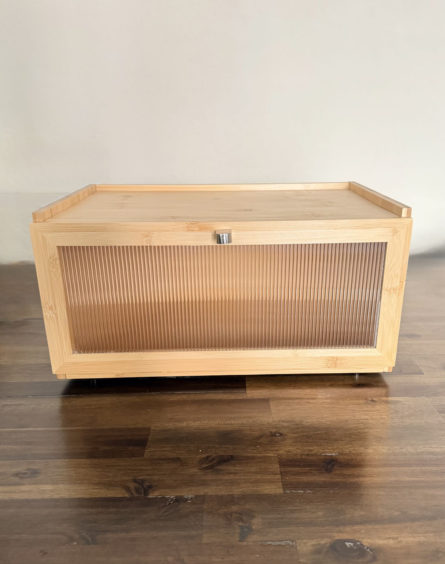 Bamboo bread box in great condition. Large capacity. Features: • Natural bamboo finish • Acrylic window panel • Front drop-down door • Compact but spacious interior Approximate dimensions: • 15.75” W • 9.84” D • 8.26” H Cash only. First come, first served.