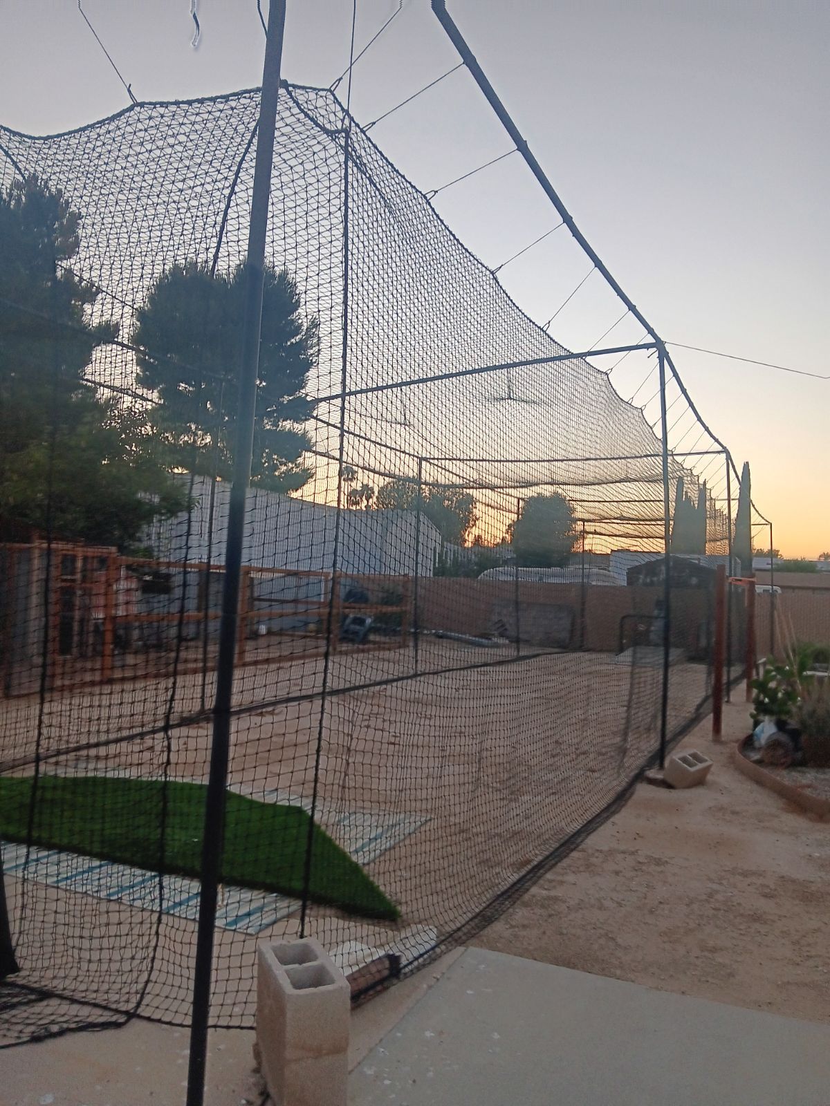 12ft H x 14ft W x 70ft L Good condition One small hole on net Includes L screen and back mat Pitching machine also in good condition Pitches up to 90mph and has a variety of pitches from a lefty and righty.