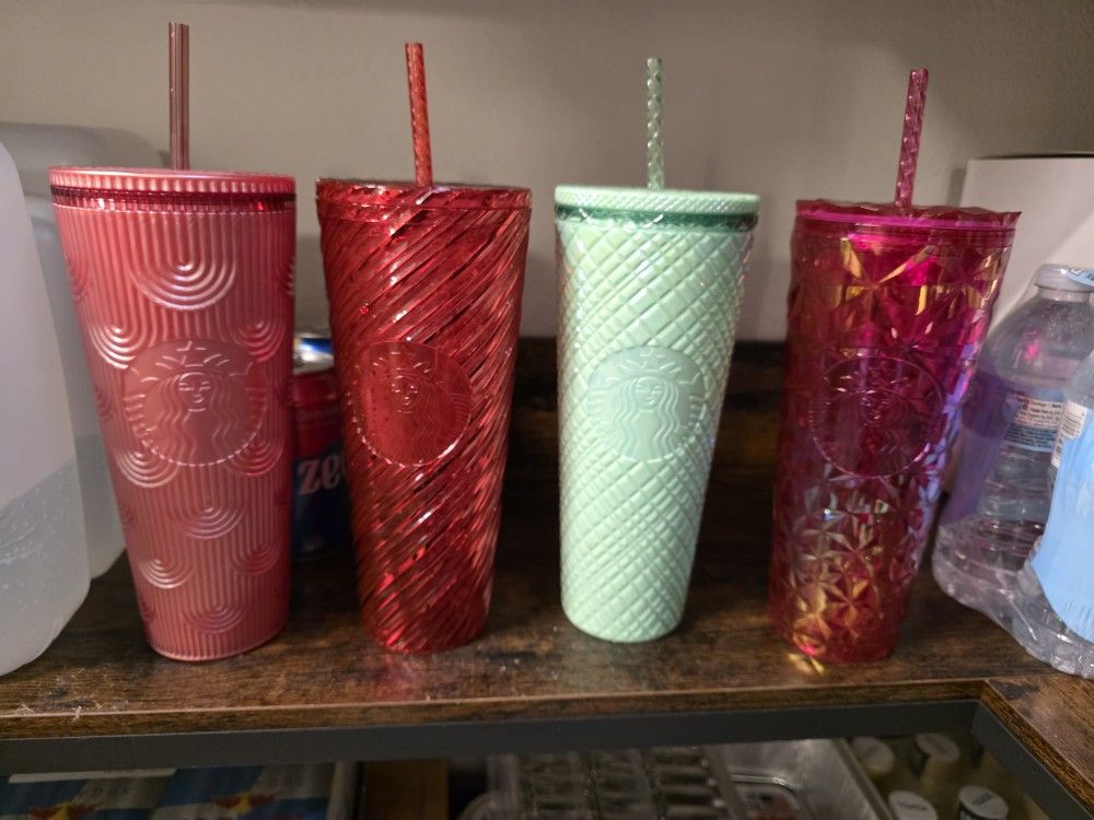 4 starbucks cups. Good condition. No missing lids or straws. Just taking up space. Must take all 4